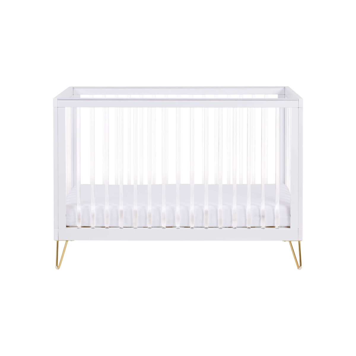 Featuring sleek, 100% recyclable, non-toxic acrylic spindles and retro-inspired hairpin metal legs, the Kimi Acrylic Cot Bed offers a distinctive style that stands out. The transparent acrylic spindles contribute to its modern look and allow for clear visibility of your baby from all angles, creating an open and airy feel in the nursery.