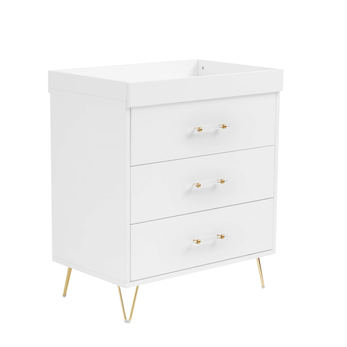 The Kimi Acrylic Chest Changer combines functionality with sophisticated design. It features a removable changer top, suitable for use from birth to 12 months (up to 11kg). Once the changing top is no longer needed, the chest serves as a timeless piece of furniture with three full-sized drawers, providing ample storage space for clothes, nappies, and other essentials. Each drawer is fitted with durable acrylic handles that match the cot bed’s design, creating a cohesive and elegant look in your nursery.