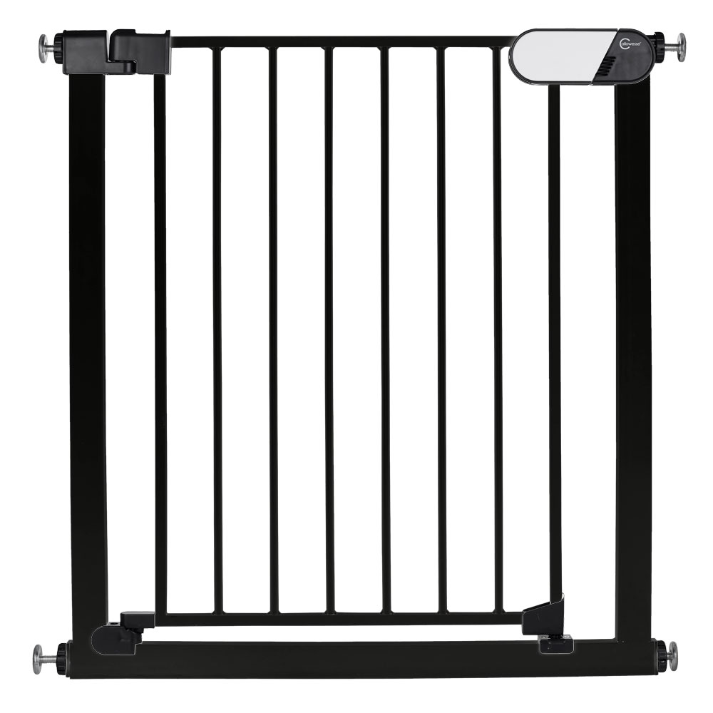 The Callowesse Kemble Child & Pet Pressure Fit Safety Gate + 7cm Extension in Black is ideal as both a baby gate and pet gate, featuring red and green locking indicators designed for standard stairs and doors. With a one-handed operation, it simplifies life when your hands are full—simply slide to unlock, tilt the handle upwards, and walkthrough.