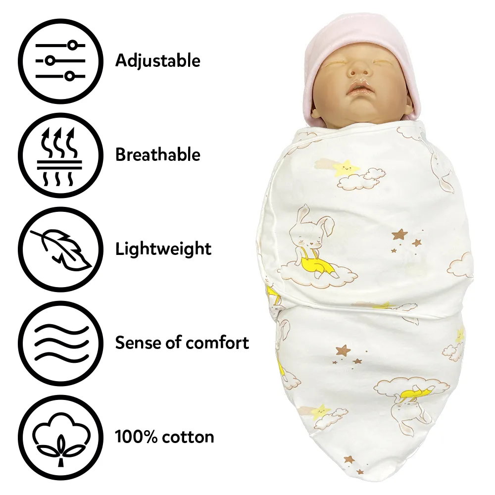 These swaddles are made from 100% premium cotton, ensuring they are soft, safe, and gentle on your baby’s sensitive skin. They are also breathable and lightweight, with a rating of 0.5 TOG / 190GSM, making them perfect for a snug yet airy fit.