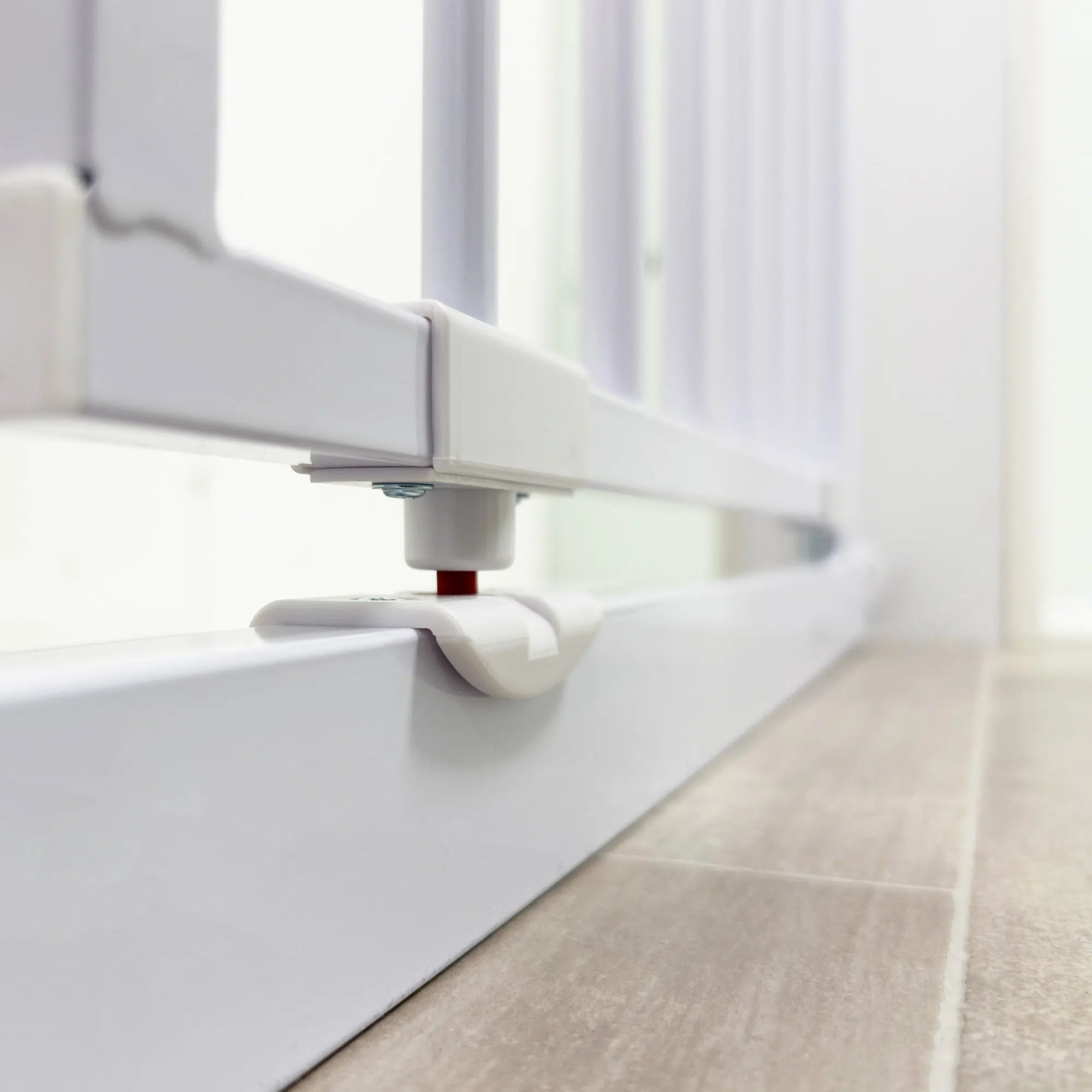 The dual locking handle system ensures your child stays safe. To open the gate, press down the top handle button and squeeze the base of the handle — a motion that is simple for adults but tough for little ones. The gate swings in both directions and features a stay-open function when positioned at 90°.
