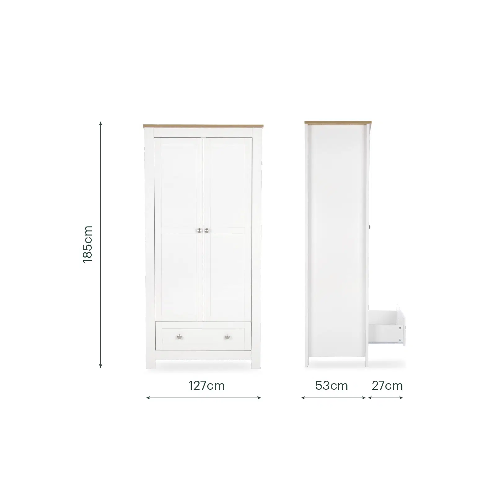 Inside, two removable hanging rails provide adaptable space for baby clothes and smaller garments. An internal shelf offers room for folded items, bedding or storage baskets, while the spacious lower drawer keeps additional essentials tucked neatly away. As your child grows, the internal configuration can be adjusted to accommodate larger clothing, ensuring the wardrobe remains practical well beyond the baby years.