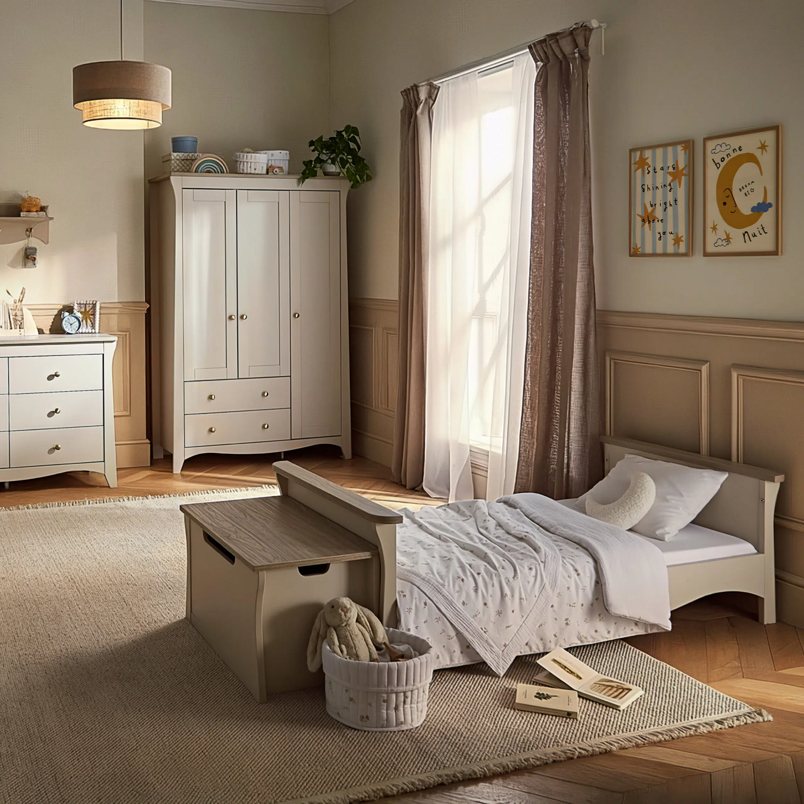 Completing the set, the triple wardrobe provides generous internal storage with adjustable hanging rails and deep shelving. Designed to adapt as your child grows, it offers flexible storage that remains useful well beyond the nursery years.