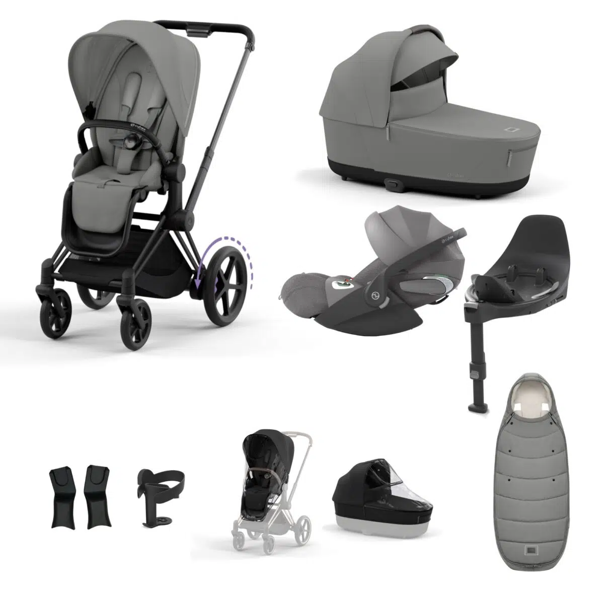 From the sturdy ePriam chassis, available in Matt Black, Chrome Black, Chrome Brown or Rose Gold, to the Cloud T i-Size infant car seat, this bundle ensures smooth journeys whether you’re walking city pavements or navigating country paths. The robust frame, large wheels and all‑terrain suspension guarantee a cushioned ride even on uneven ground.