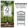 Crafted from FSC® certified wood, this highchair supports eco-conscious parenting while offering a timeless, natural look that fits seamlessly into any home. Its stable, tilt-resistant design ensures mealtime safety, while floor gliders provide added stability when your child pushes back from the table.