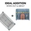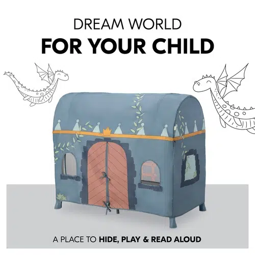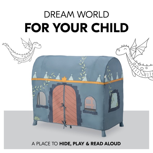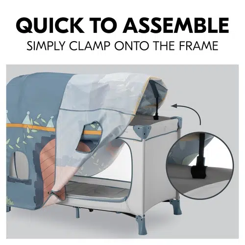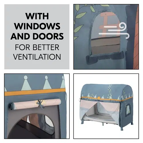 With a tool-free setup, the cover clamps easily onto the cot frame, allowing quick assembly and removal. Thoughtfully designed windows and doors promote airflow while providing children with plenty of ways to engage in active role play. Large and small entrances encourage independence, letting little adventurers crawl in and out as they please. Suitable for indoor and outdoor use, it’s made from easy-clean materials, making it a practical choice for families on the go.
