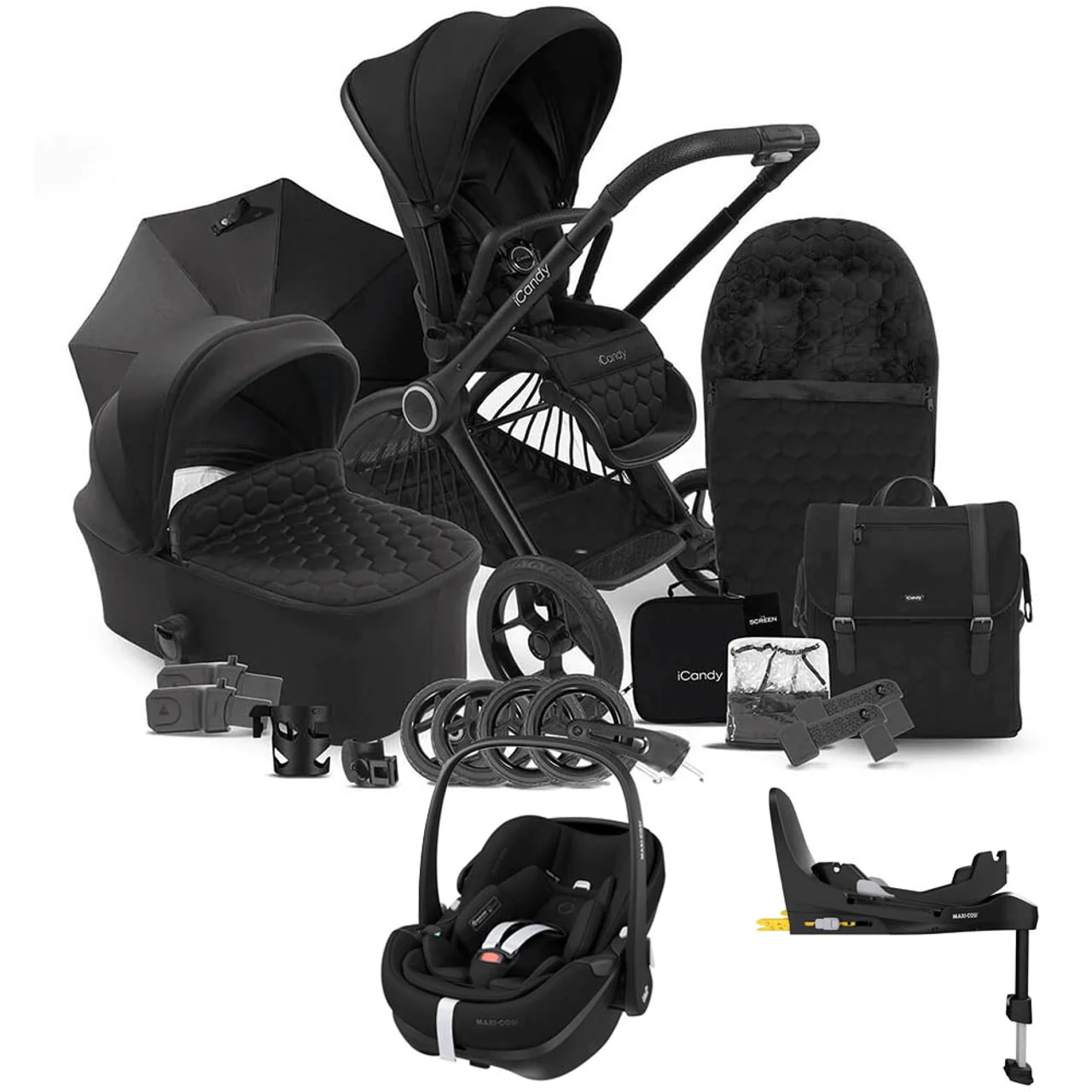 The iCandy Core Complete Travel System + Maxi-Cosi Pebble Pro Car Seat & Pro Slide Base offers a comprehensive set, making this pushchair an exceptional travel system. It includes the Maxi-Cosi Pebble 360 Pro, Maxi-Cosi Pro Slide Base, and car seat adaptors.
