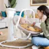 A 90° seat rotation lets you switch between front‑to‑back and side‑to‑side swinging — mimicking the natural motion of being held and rocked in your arms. The pivoting carry handle makes it easy to move the seat when used as a rocker, and the overhead toy bar with two plush toys keeps your little one engaged. When little accidents happen, the infant body support and seat pad are easily removable and machine washable so the seat stays fresh and clean.