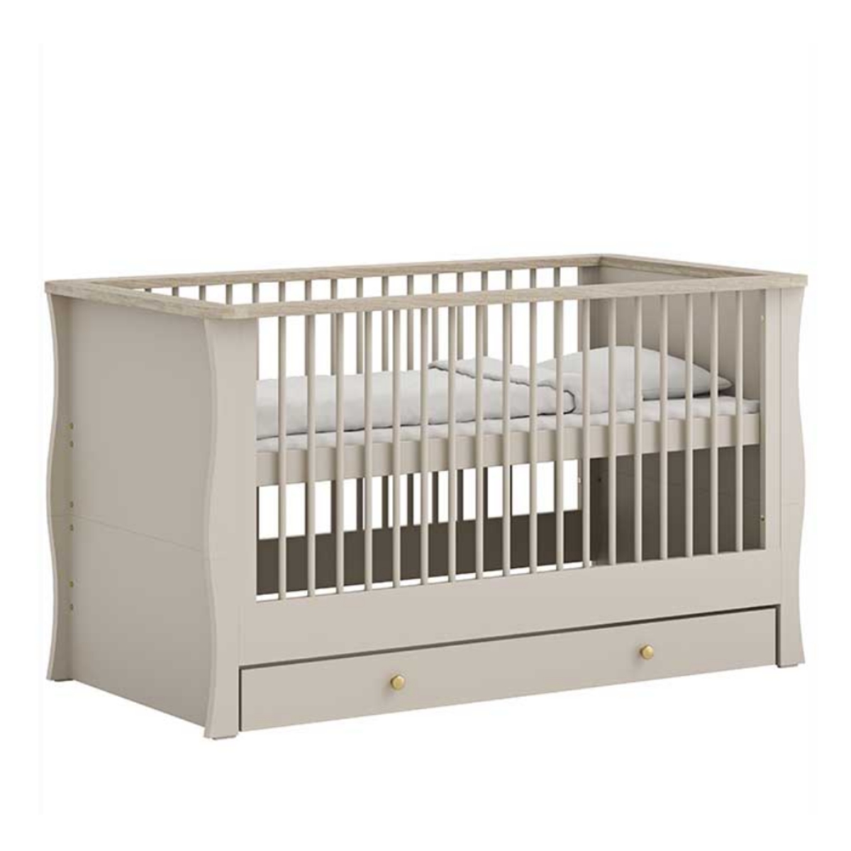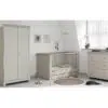 Create a stunning nursery for your little one with the Little Acorns Celeste 3 Piece Room Set with Drawer. This elegant set includes a Cot Bed, Dresser, and Wardrobe, offering practical storage solutions and a sophisticated aesthetic. The modern Cashmere and Grey Ash finish, paired with brushed gold knobs, adds warmth and charm to any nursery. Designed with both style and functionality in mind, this set will grow with your child from birth through toddlerhood.