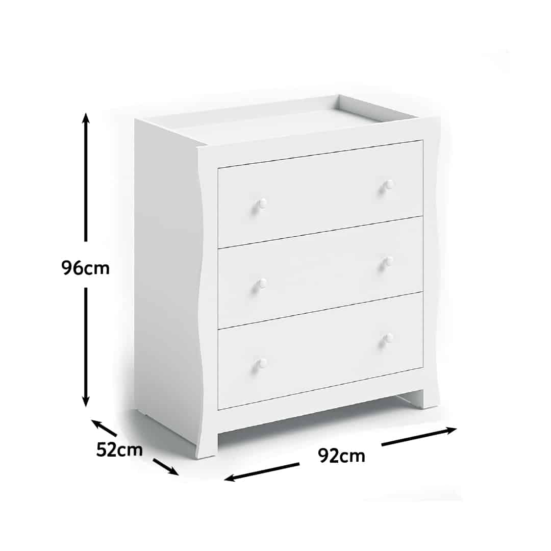 The beautiful, classically styled dresser not only provides you with 3 easy-glide full-length drawers which are ideal for storing clothes or bedding, but also offers a dedicated space, at an ideal height in which for you to change your baby’s nappy. The handy changing station is suitable for use to around 12 months.