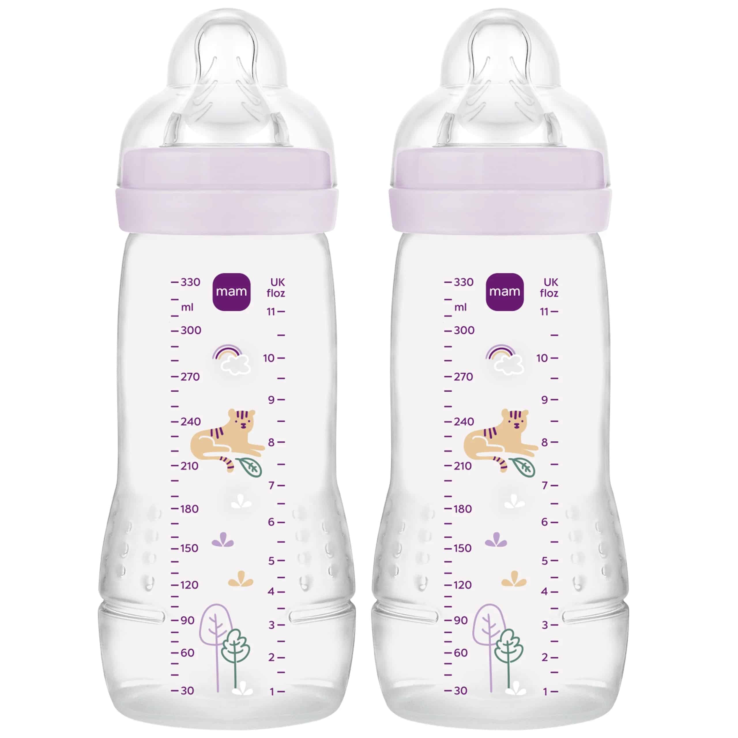 The MAM Easy Active baby bottle is really easy to use which makes it perfect for an active child. The charming illustrations on the side make it decorative as well as practical. The soft and flat SkinSoft™ silicone nipple feels just like a mother’s breast which makes it easier to combine bottle feeding with breastfeeding. Surveys by MAM show that 94% of babies accept the nipple.