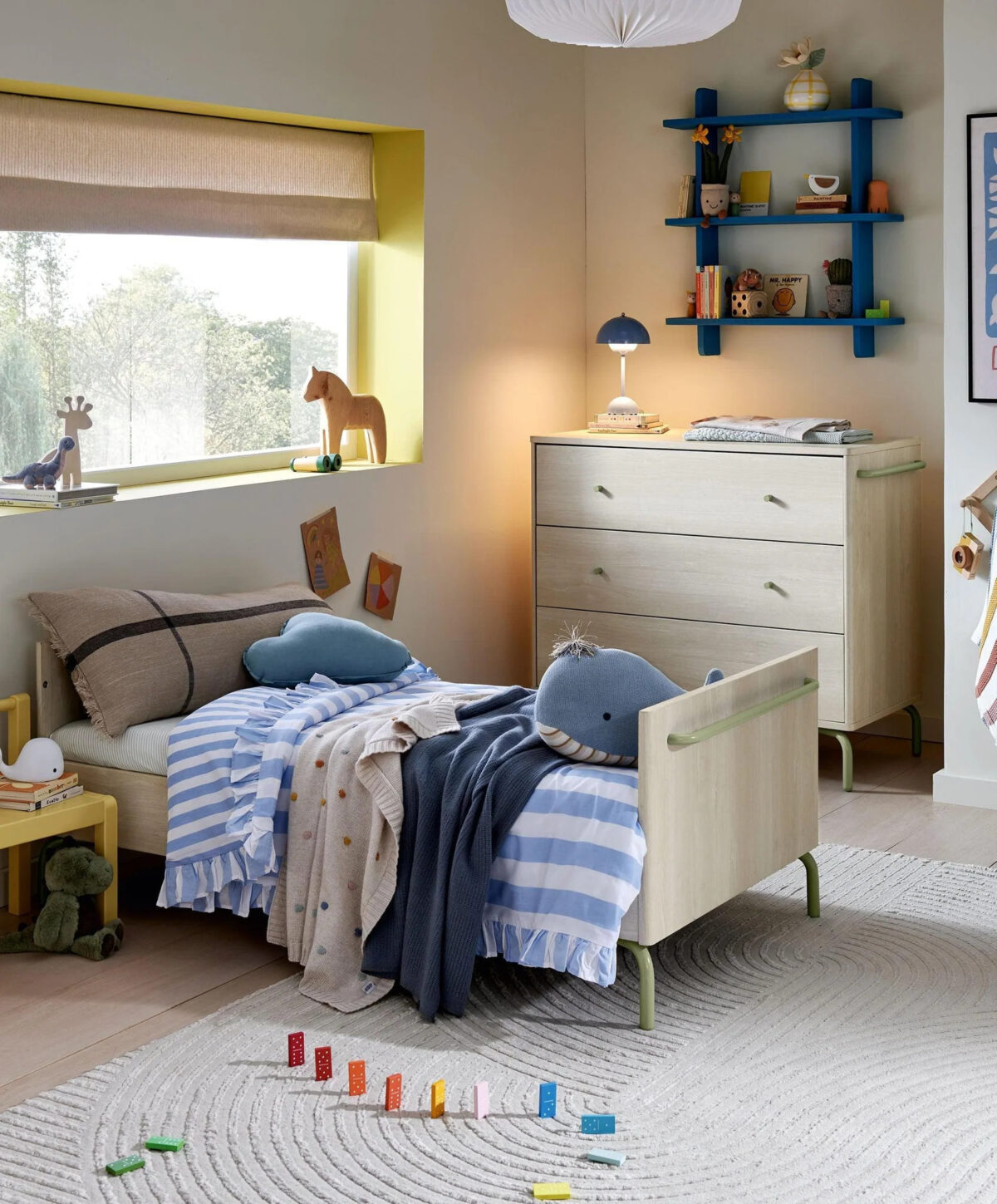 Mamas & Papas have cleverly combined the hallmarks of a utilitarian aesthetic—modern metal tubing, natural wood finishes, and colourful accents—with the softness and warmth of rounded shapes to create a collection that embodies bold, modern interiors without losing the gentle charm a nursery deserves.