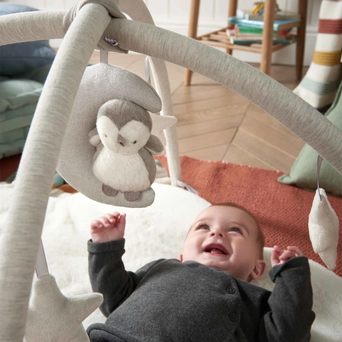 Equipped with removable gym arches, this playmat includes four hanging toys, encouraging hand-eye coordination and motor skill development. The hanging musical toy provides added entertainment, engaging babies with sound while stimulating their curiosity. A soft penguin toy is also included, offering an additional interactive element for playtime. As part of the Dream Upon a Cloud interiors collection, this playmat coordinates beautifully with other pieces in the range, featuring the same signature characters and delicate embroidered detailing.