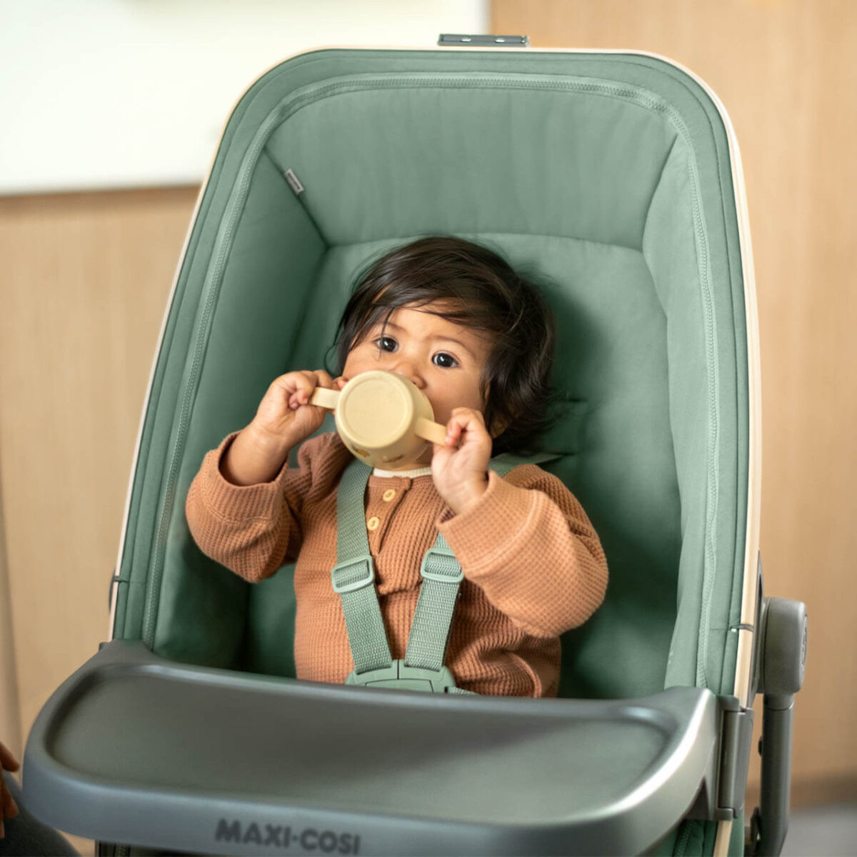 When your child is ready to sit up, they can use the Maxi-Cosi Alba high chair with the Alba meal kit from 6-months until approx. 3 years (15kg). The meal kit tray is simply clipped on the frame and the cover is water repellent and machine washable, which makes it easy to keep clean. The padded high chair seat gives your child a comfortable seat at the table with you, from breakfast through to dinner time.