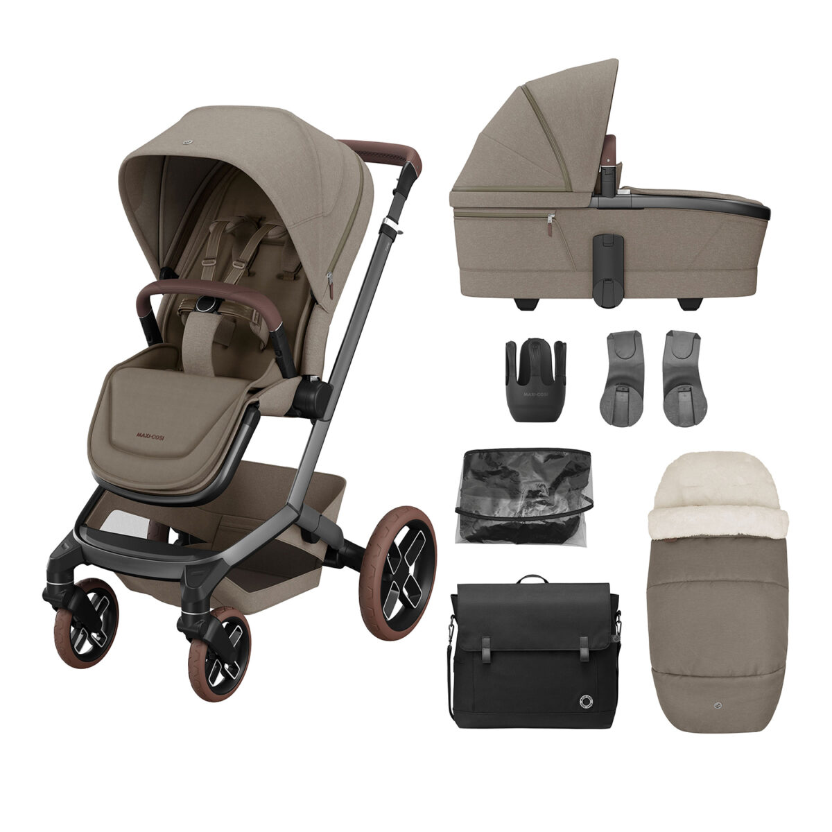 Maxi-Cosi Fame Essential Pushchair & Carrycot Bundle – Twillic Truffle with Brown Wheels