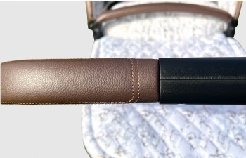 The pushchair features a luxurious leatherette handle, offering a stylish and comfortable grip for parents on the go, enhancing both functionality and aesthetics.