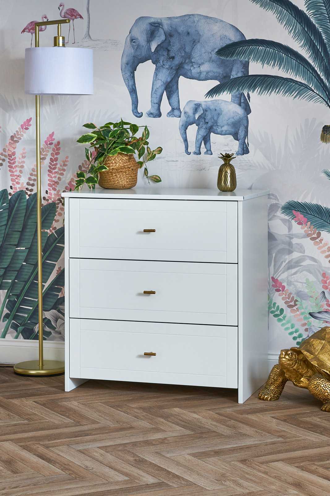 The three large drawers fronted by stylish brass handles provide plenty of storage. The beautiful natural wood changing top is removable, so when your little one has grown, you are left with a beautiful chest of drawers that will compliment any room of the house for years to come.