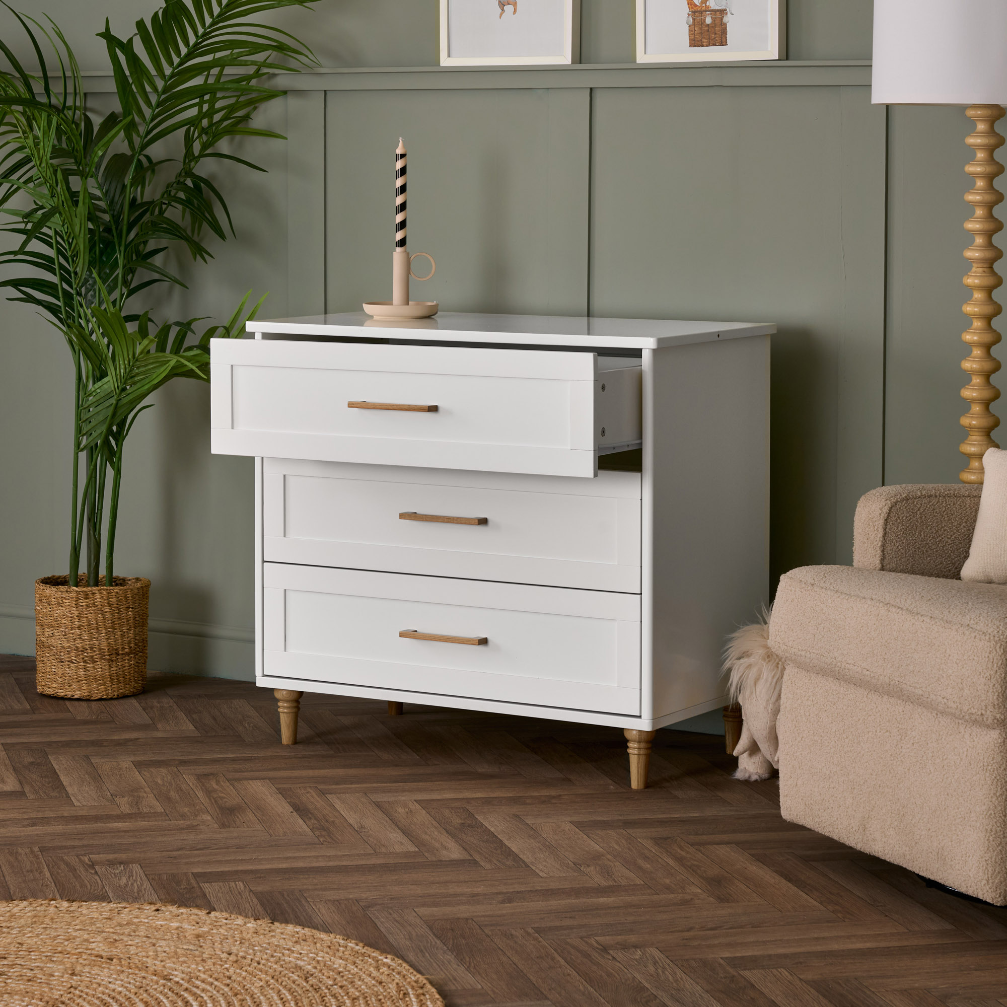 Storage is a priority when it comes to baby essentials, and the Orla Changing Unit delivers with three extra-wide drawers. Whether you need space for nappies, wipes, clothing, or blankets, this unit ensures everything is within easy reach. The extra-wide design makes organisation simple, allowing you to quickly grab what you need during those busy mornings and late-night changes. The solid wood handles contrast beautifully with the soft white finish, blending style with functionality.
