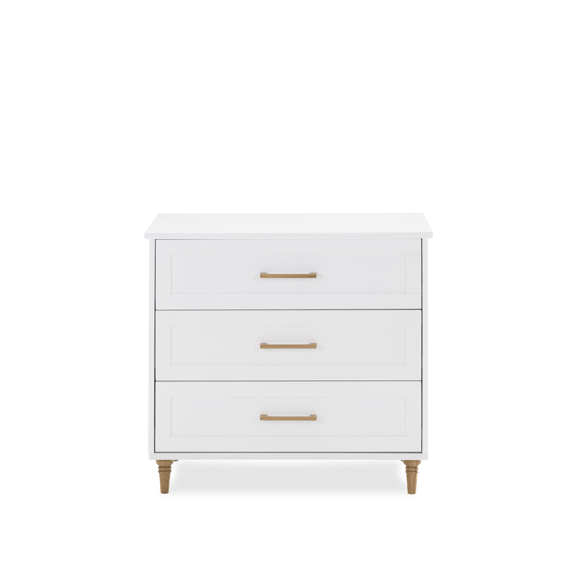 - Storage: Three extra-wide drawers with natural wood handles