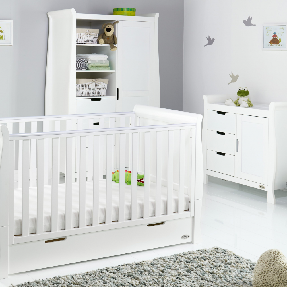 The Obaby Stamford furniture range offers families the perfect combination of style, quality and practicality. The Stamford Classic 4 piece room set consists of the beautiful Stamford Classic cot bed with under drawer, closed changing unit, double wardrobe and tall chest of drawers. All pieces feature the same elegant sleigh design that flows throughout the Stamford range.
