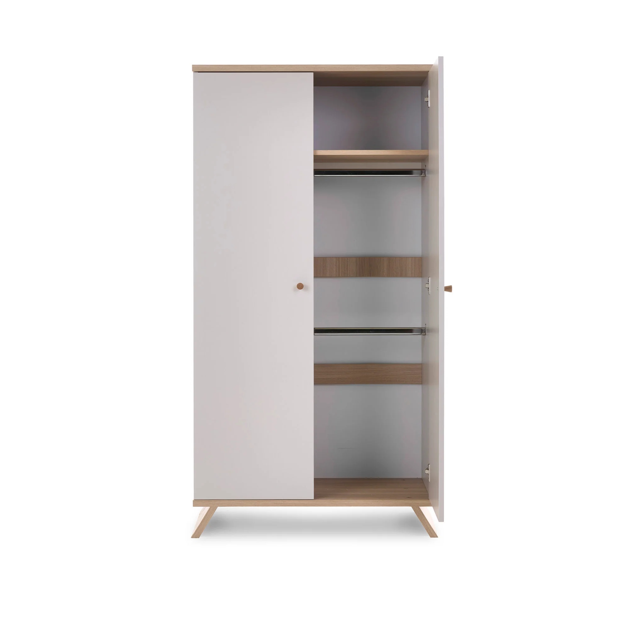 Completing the set, the Thea wardrobe provides ample storage with two generous hanging rails and a sleek, minimalist finish, while the optional wall shelf adds the perfect finishing touch with two open shelves and hanging pegs for everyday essentials.