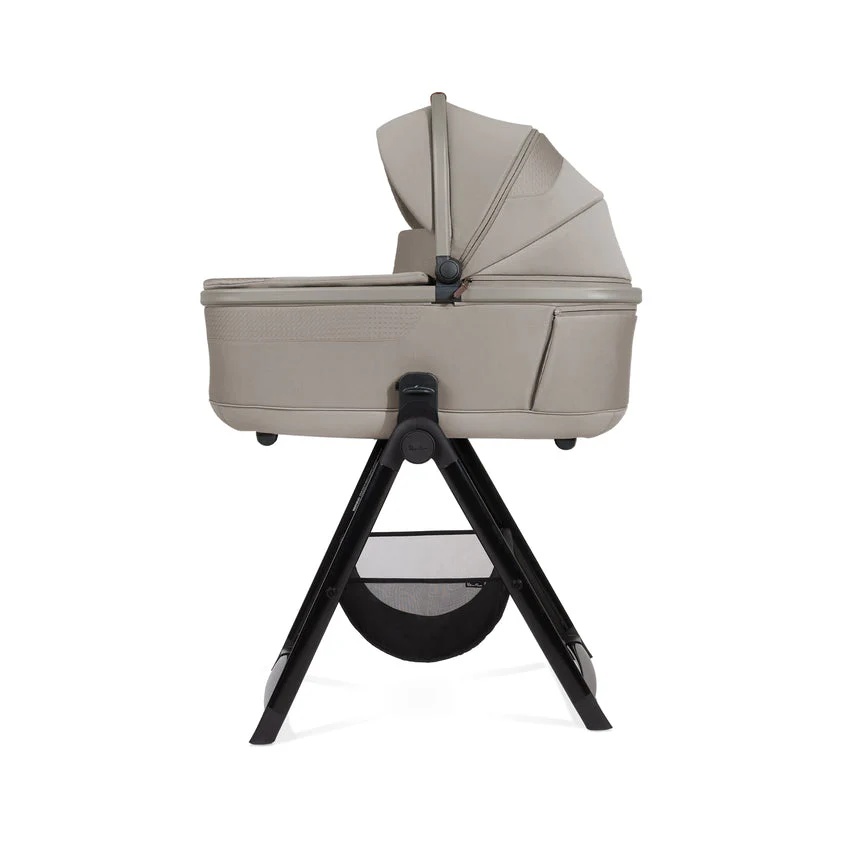 The stand folds completely flat for effortless storage and transport, then unfolds in seconds when needed. This makes it ideal for moving between rooms, visiting family or staying overnight where space may be limited. A generously sized storage basket beneath the stand keeps everyday essentials such as nappies, blankets and bottles close at hand, so everything you need is within easy reach.