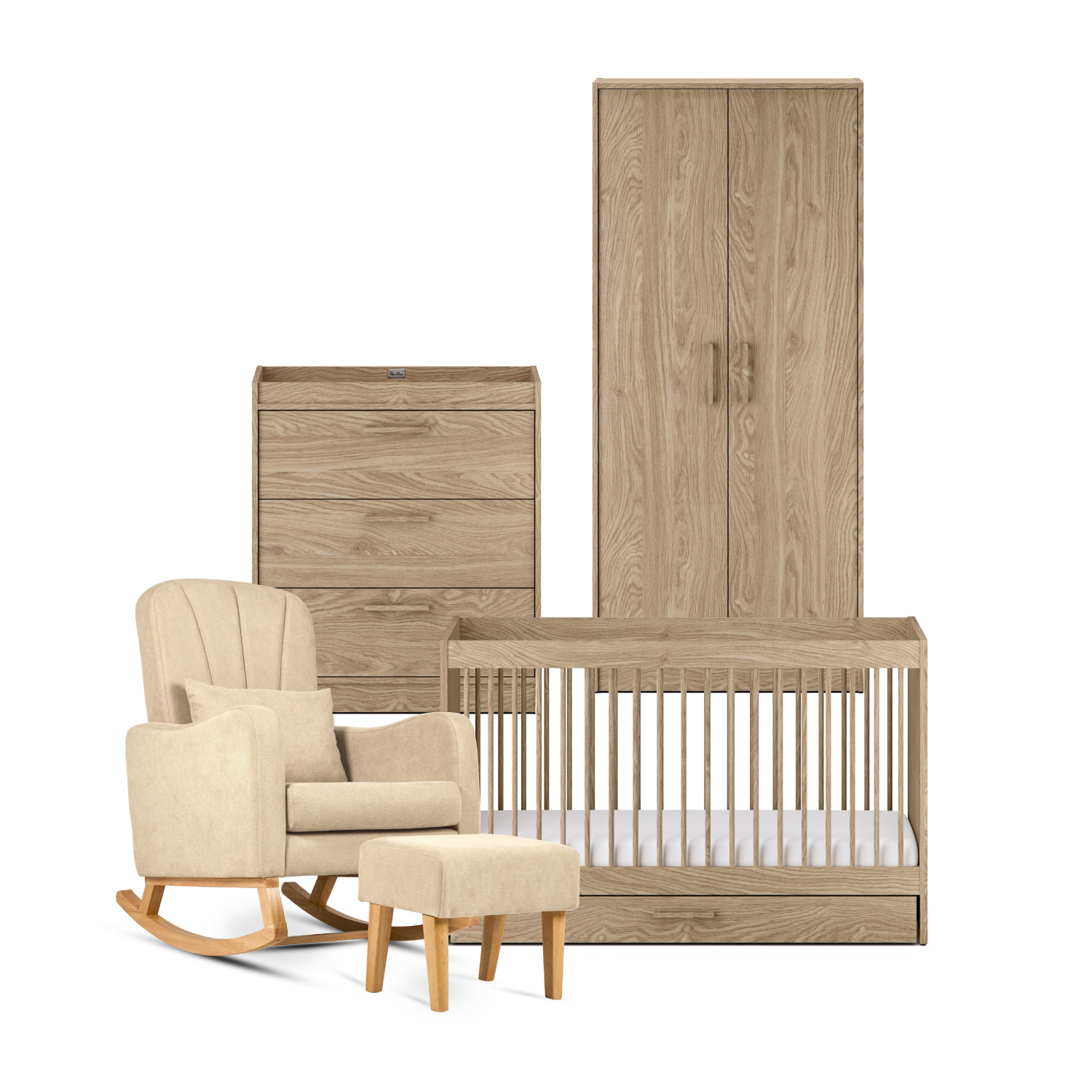 The Silver Cross Geneva 4 Piece Nursery Furniture Set with Carmel Nursing Chair & Footstool – Natural Oak is a beautifully coordinated collection that blends elegance, comfort, and practical functionality for your baby’s first bedroom. Inspired by timeless Scandinavian design, this set features a calming natural oak finish with textured detailing, creating a peaceful and sophisticated space where you and your baby can grow and bond together.
