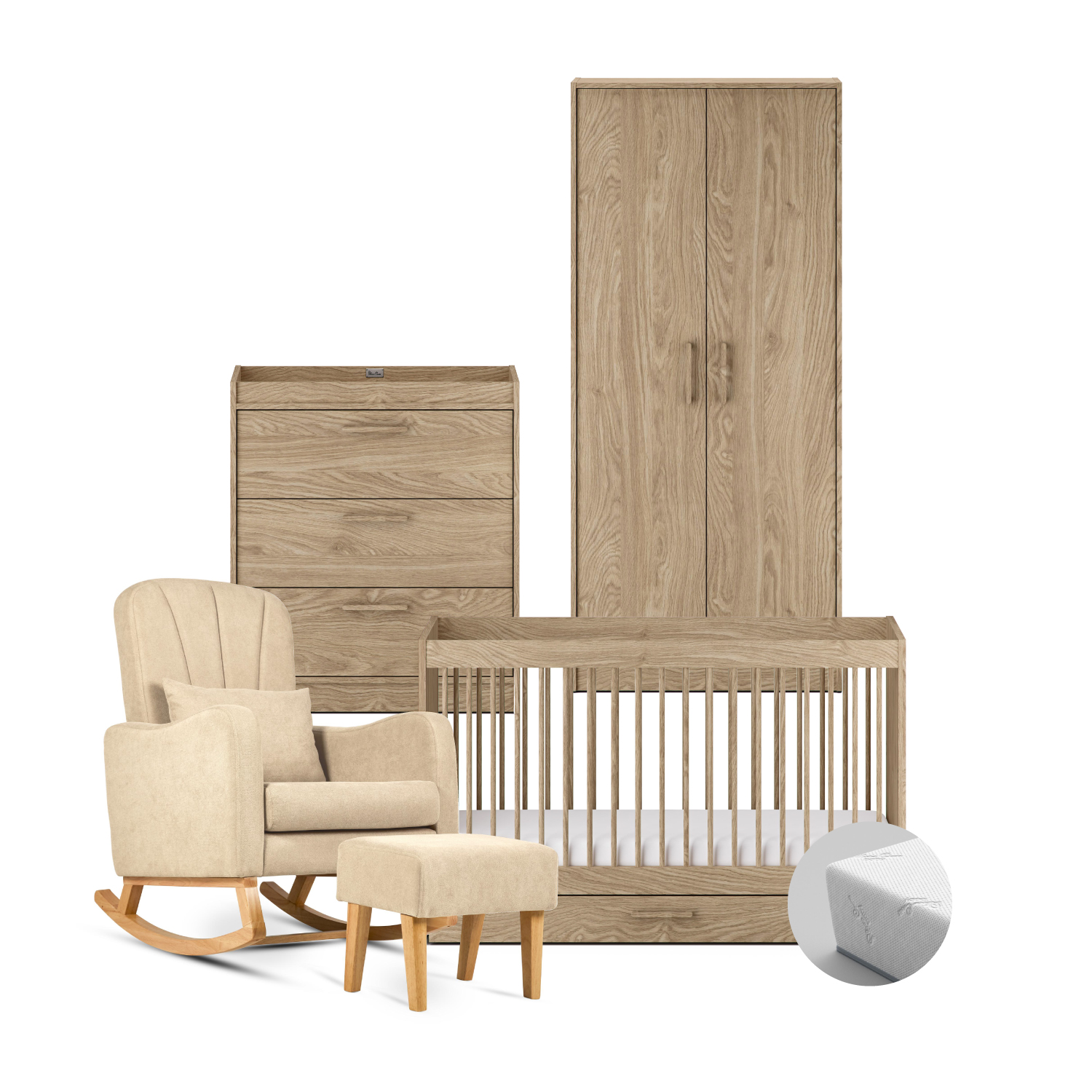 This comprehensive 5-piece set includes a convertible cot bed, a full-size dresser with integrated changer top, a spacious wardrobe, the TrueFit™ Eco Fibre Cot Bed Mattress, and the Carmel nursing chair with footstool. Crafted for durability and designed with growing families in mind, every element works in harmony to bring you long-lasting quality and practical solutions throughout your baby’s early years.