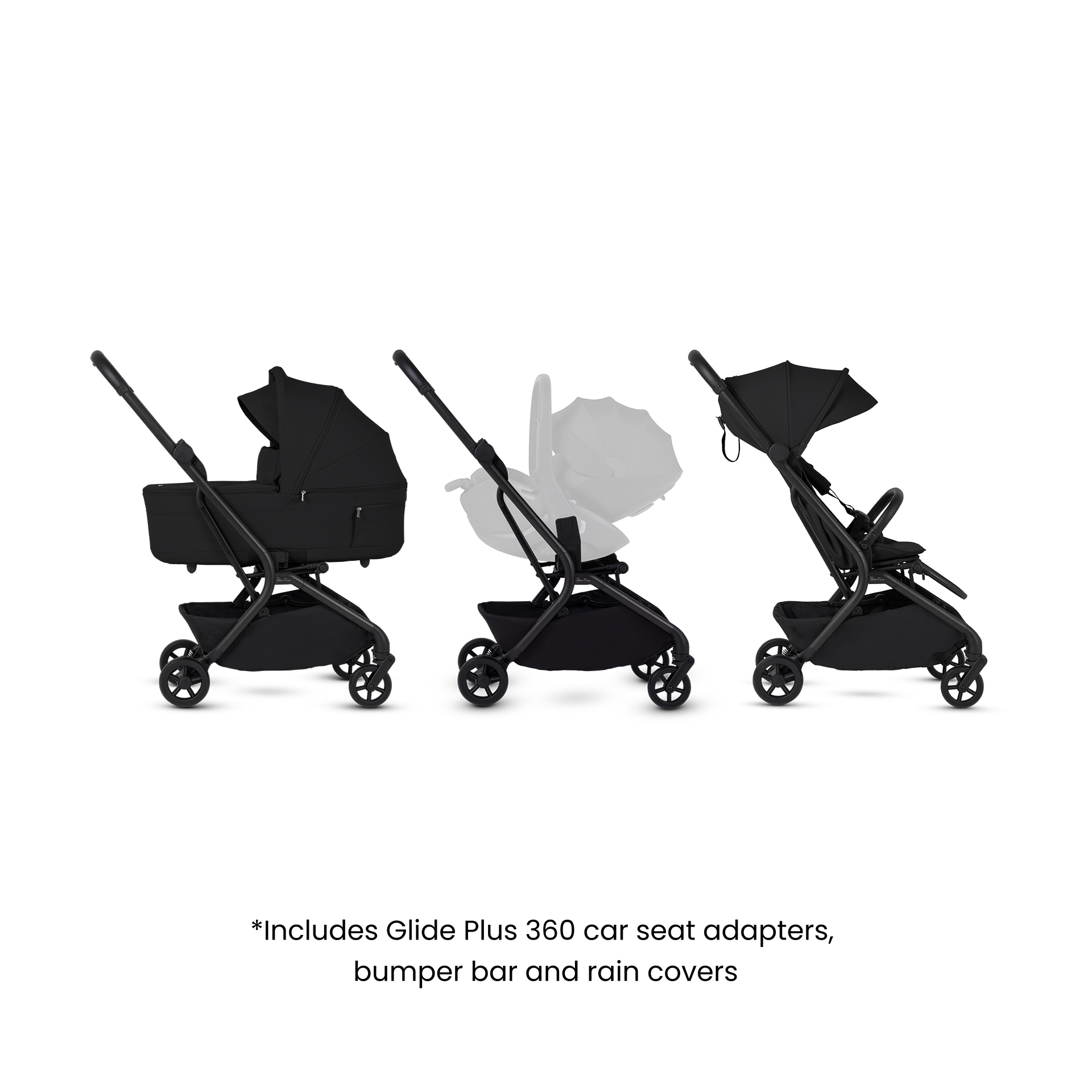 • Included accessories: Stroller, carrycot, bumper bar, two rain covers, Glide Plus 360 adaptors