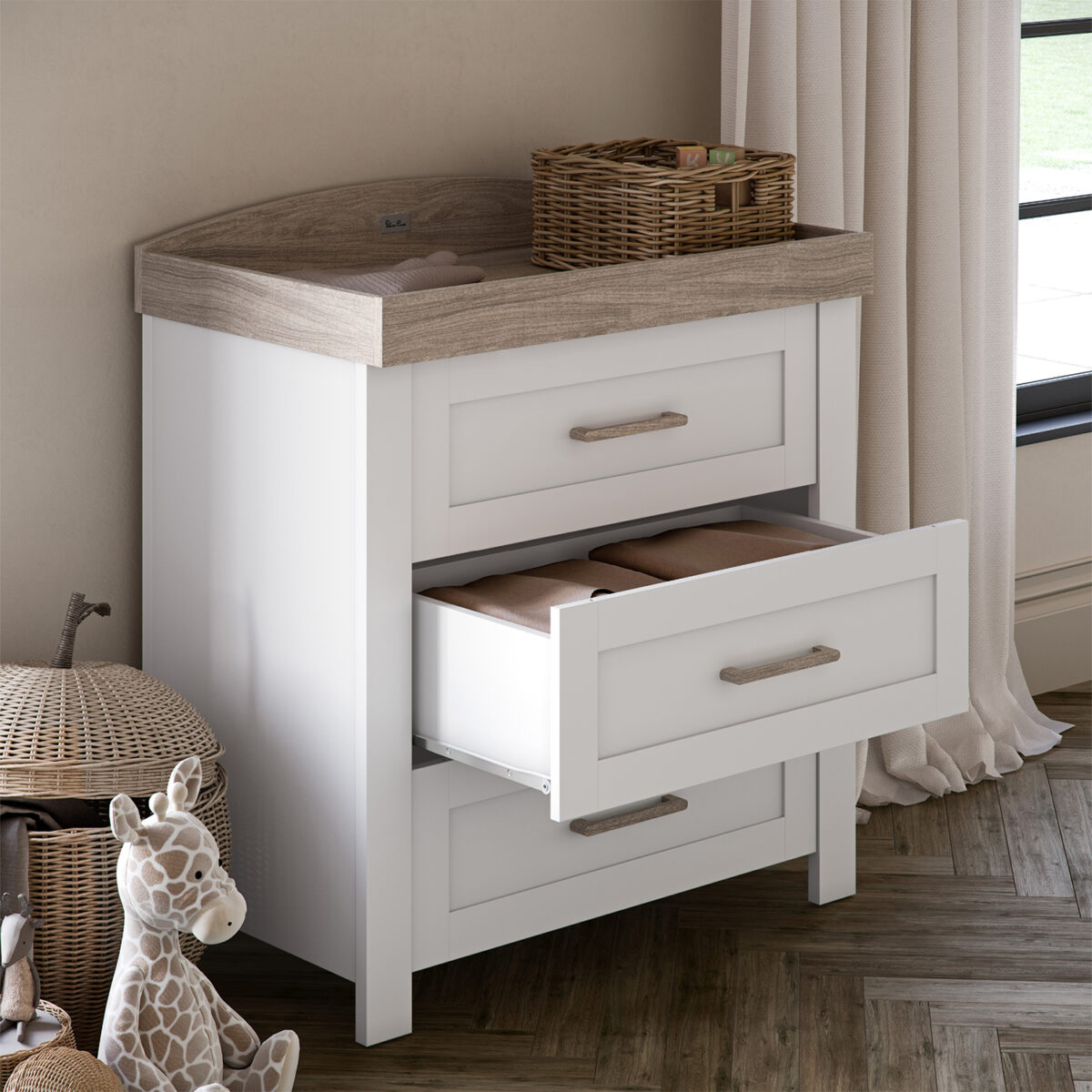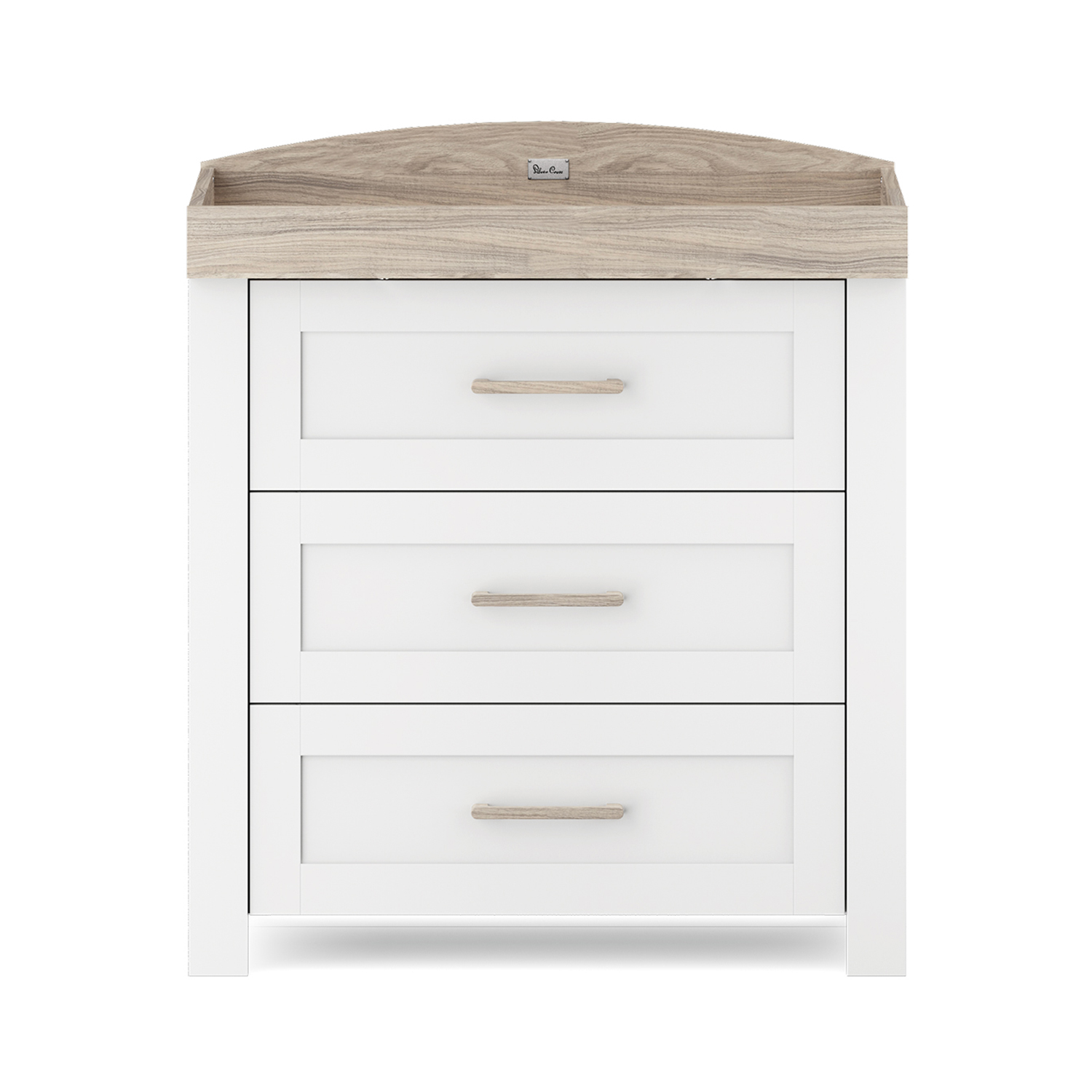 The Valencia dresser offers three deep drawers, providing plenty of space for storing clothing, bedding, and other baby essentials. The removable changer top can be attached to the dresser for easy nappy changes. When no longer needed, it can be removed and repurposed as a stylish arts and crafts tray or additional storage, making this dresser a long-lasting and versatile piece for your nursery.