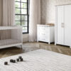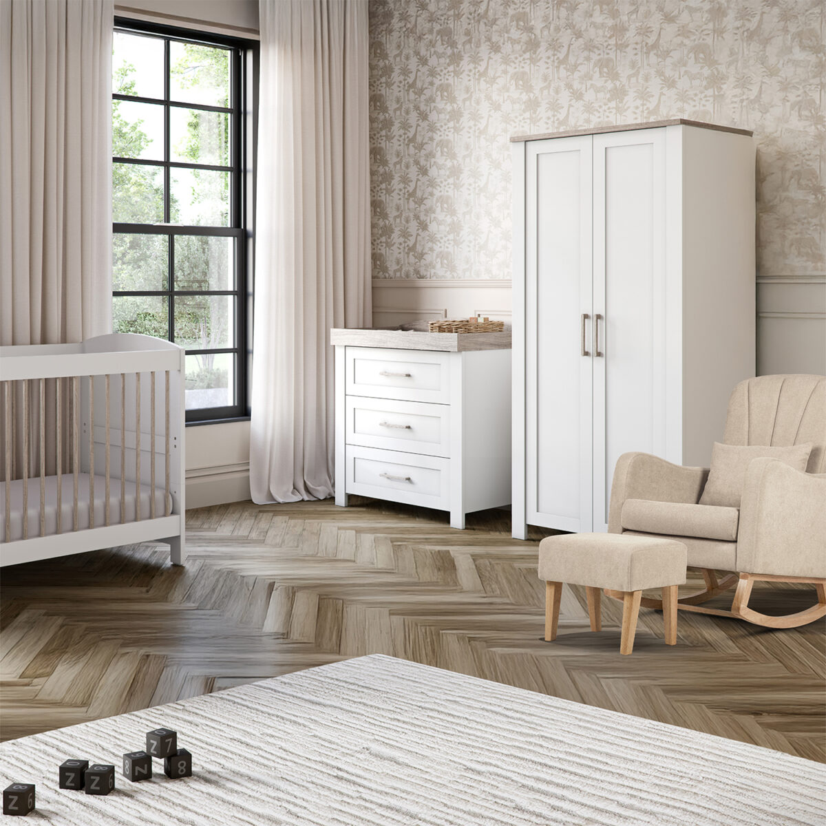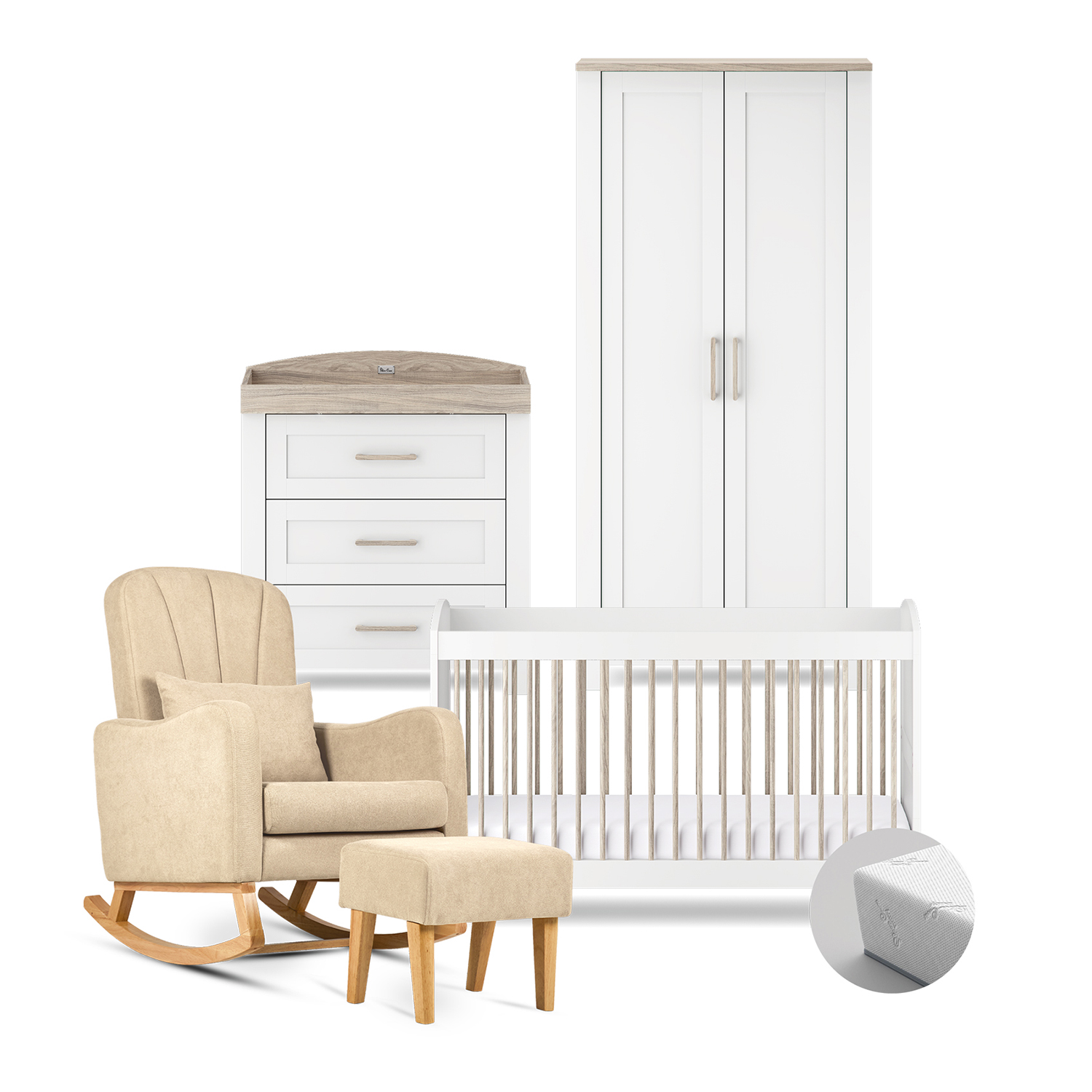 Create your dream nursery with the Silver Cross Valencia 5 Piece Nursery Furniture Set, designed to grow with your little one from newborn to toddler. Featuring a timeless white finish with natural ash accents, this two-tone collection offers a calming, neutral canvas that complements any nursery decor. The set includes a convertible cot bed, a spacious dresser with a removable changer top, a full-size wardrobe, the TrueFit™ Eco Fibre Cot Bed Mattress, and the Carmel nursing chair to make those special moments with your little one even more memorable.