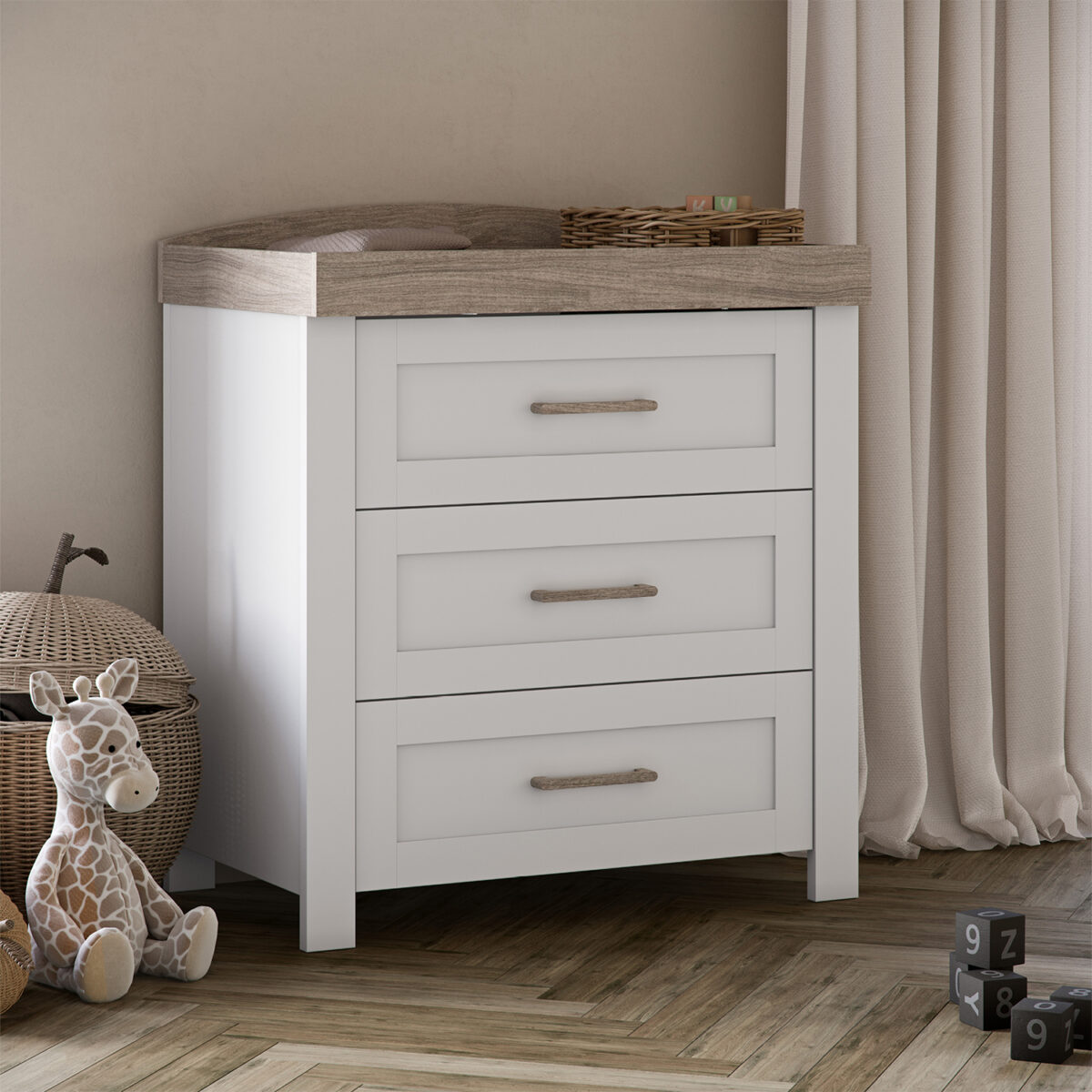 - Timeless white and natural ash finish – Neutral two-tone palette for a versatile, elegant nursery look