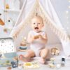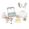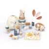 Crafted from high-quality FSC-certified wood, the toy box promises durability and longevity. Its cheerful multicoloured design adds a playful touch to any nursery or playroom. Along with the storage box itself, the set includes a variety of engaging toys — building blocks with a fabric pouch, a stacking rabbit, a chick puzzle, and a pull-along hedgehog — ensuring endless fun and learning opportunities.