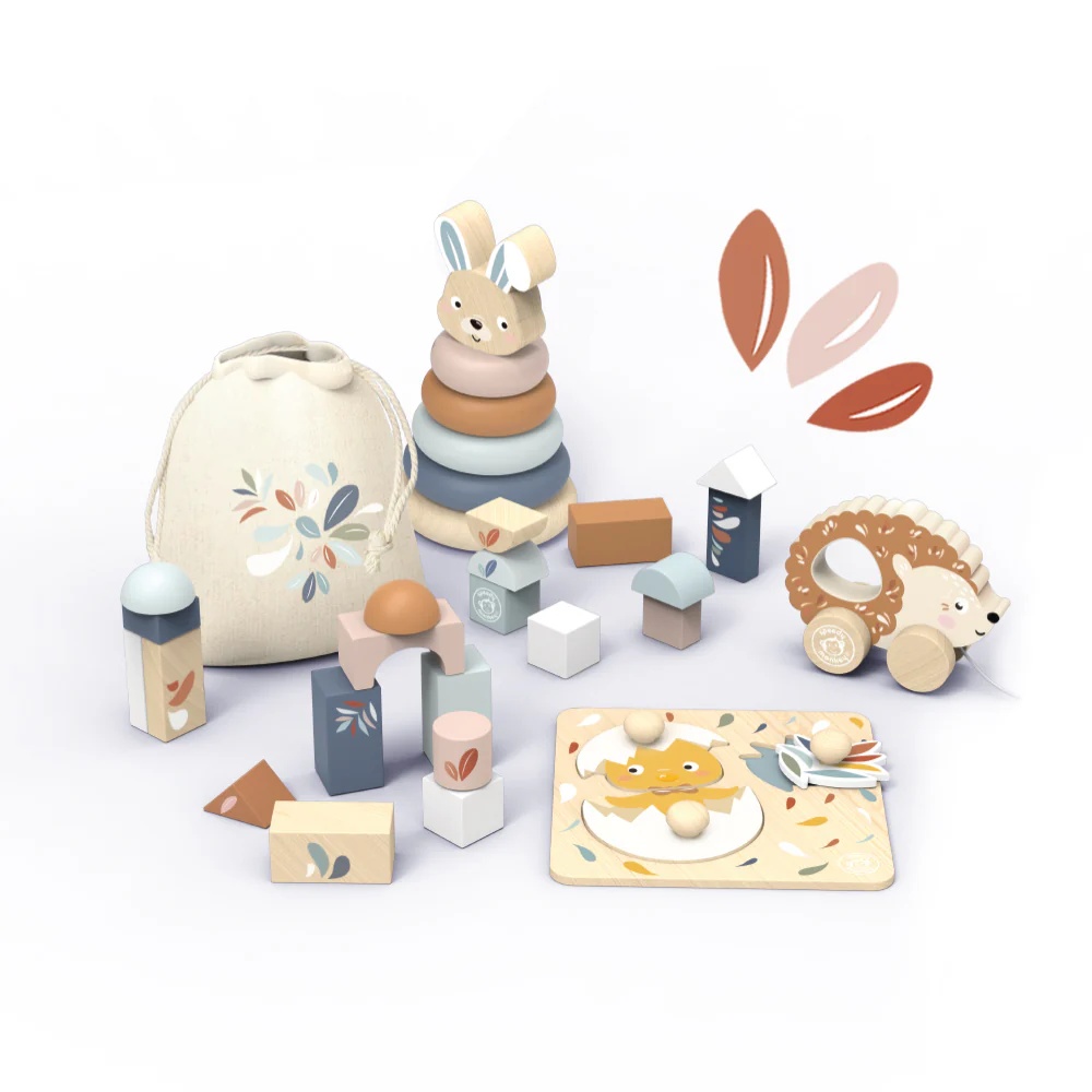 Includes four classic toys: building blocks with pouch, stacking rabbit, chick puzzle, and pull-along hedgehog