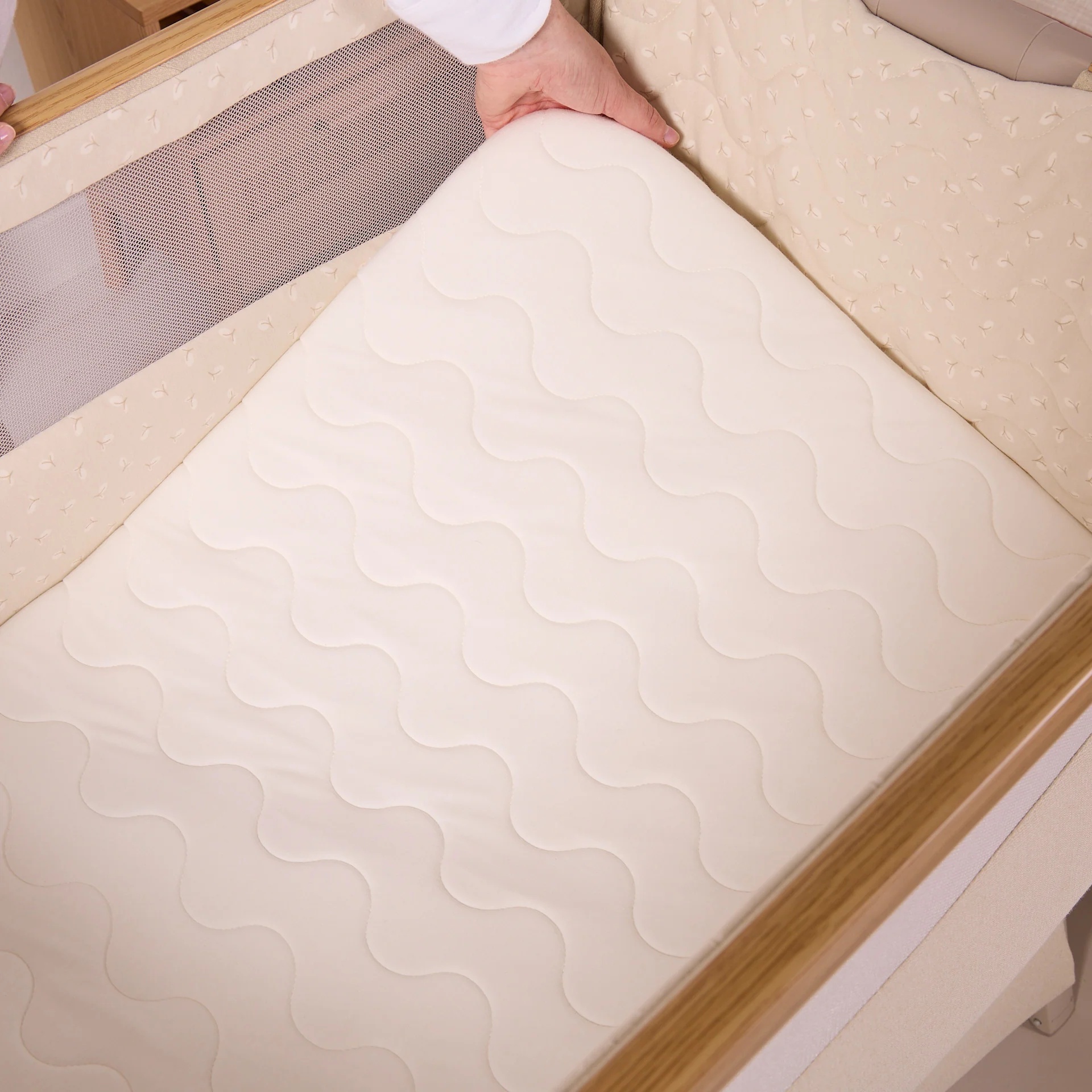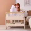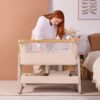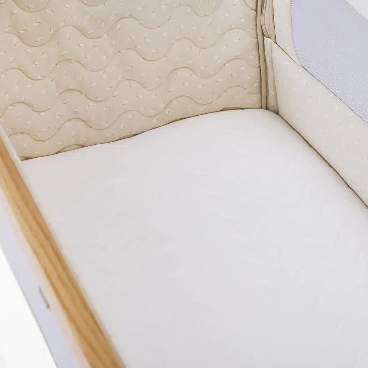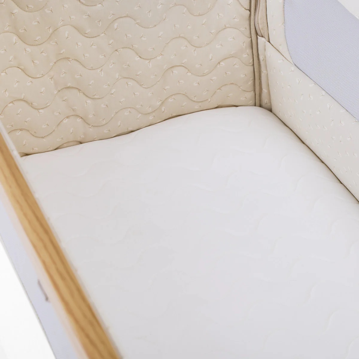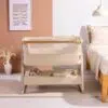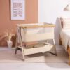 The CoZee Air 2 Bedside Crib in Toasted Oak/Sand combines elegant design with practical features, offering a calm and comfortable sleep space for your baby from day one. Its refined finish, quilted lining, and mattress cover bring a touch of luxury, while hidden ventilation holes in the side barrier ensure breathability throughout the night.