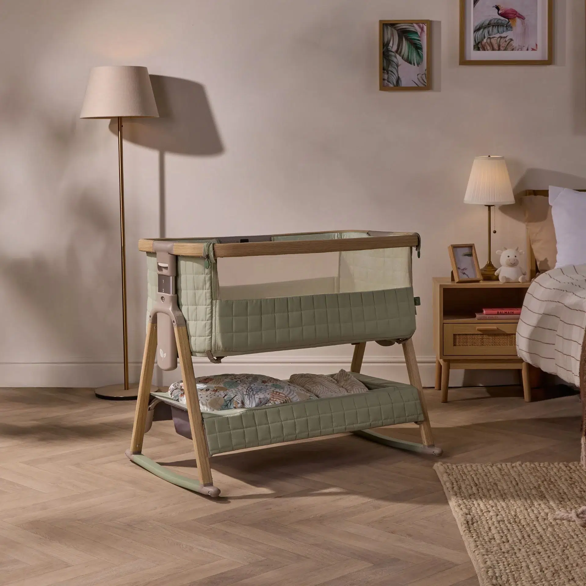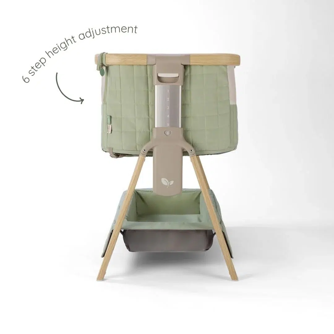 The CoZee Sense Bedside Crib in Drifted Oak/Eucalyptus combines bedside closeness with an integrated sensory bar, offering soft light, ambient sound, and gentle projection in a cohesive design. Crafted with premium quilted fabrics, breathable mesh panels, and a soft bamboo-jersey mattress cover, it provides both comfort and contemporary style.