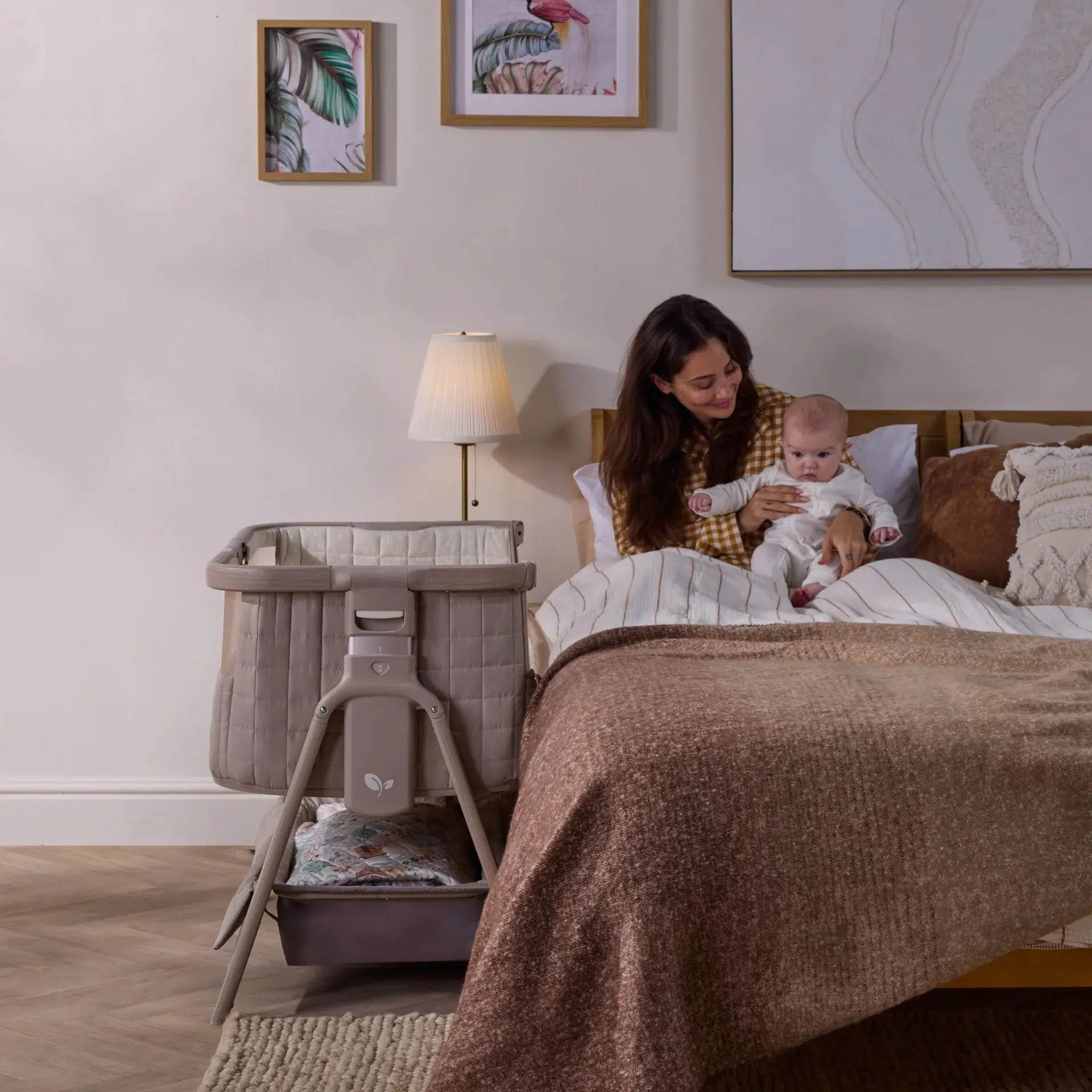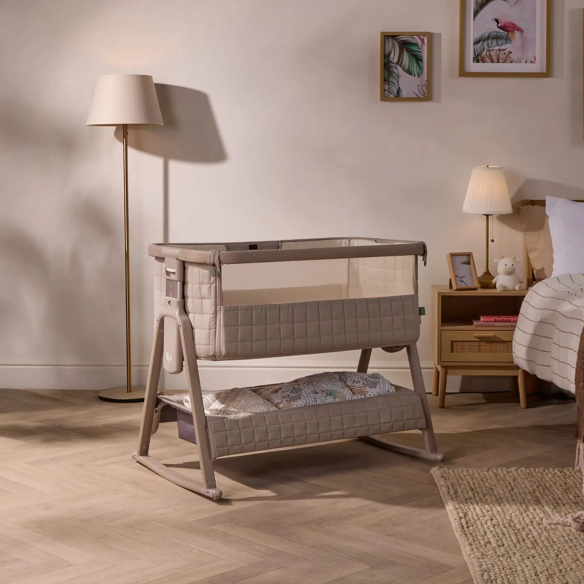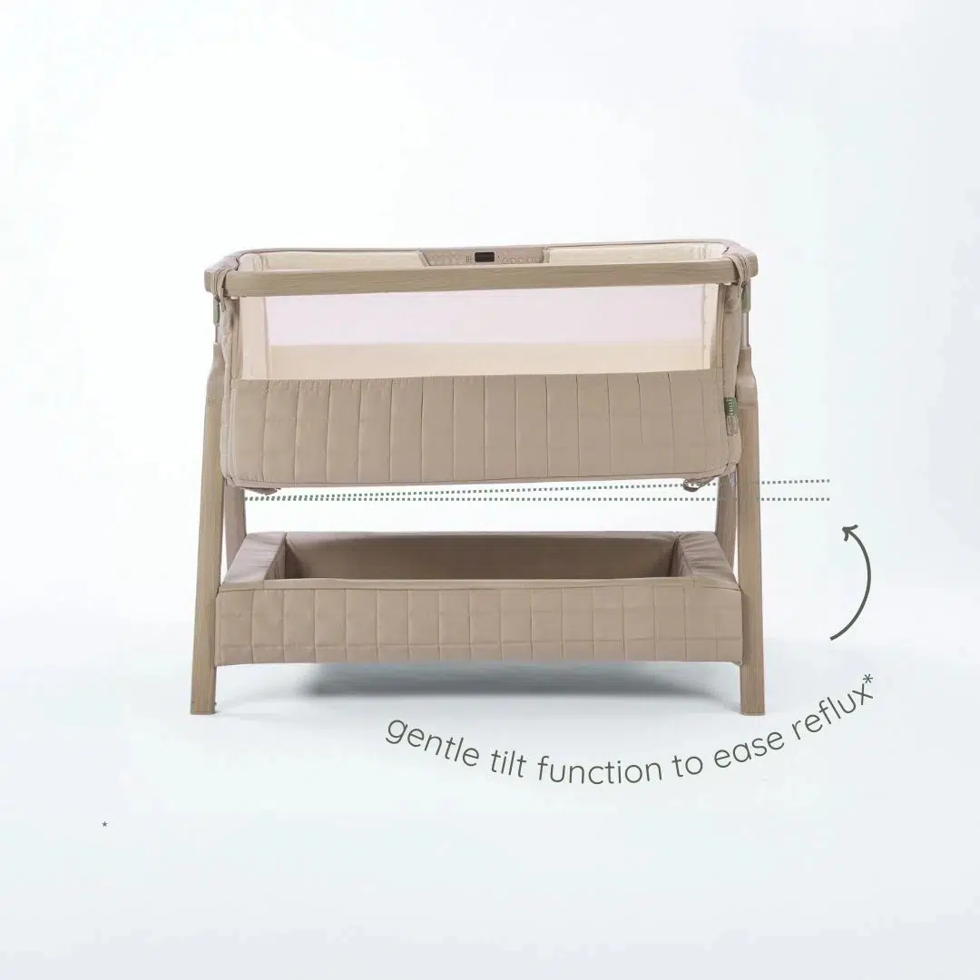 The CoZee Sense Bedside Crib in Soft Walnut / Cocoa combines bedside closeness with an integrated sensory bar, offering soft light, ambient sound, and gentle projection in a cohesive design. Crafted with premium quilted fabrics, breathable mesh panels, and a soft bamboo-jersey mattress cover, it provides both comfort and contemporary style.