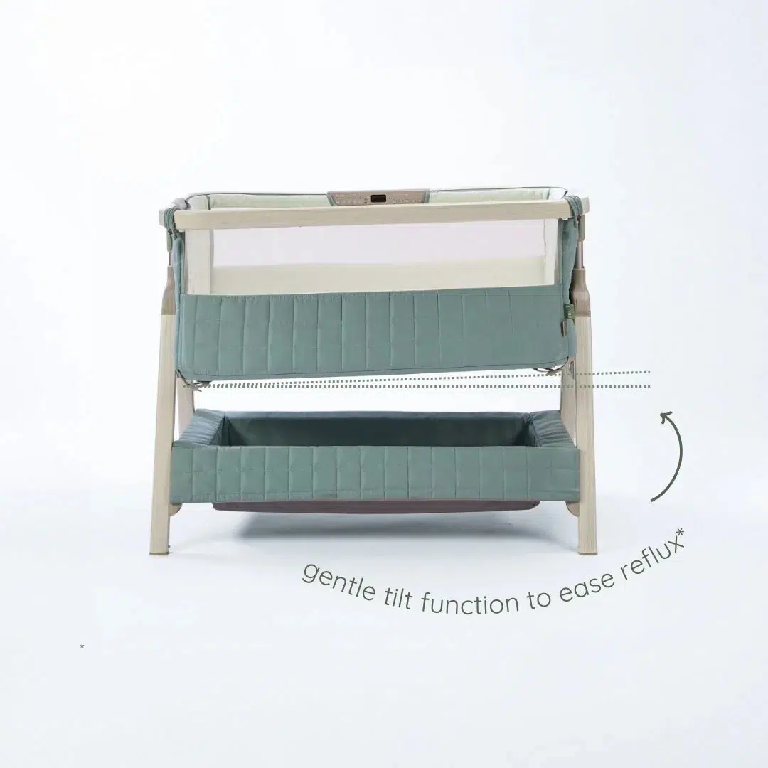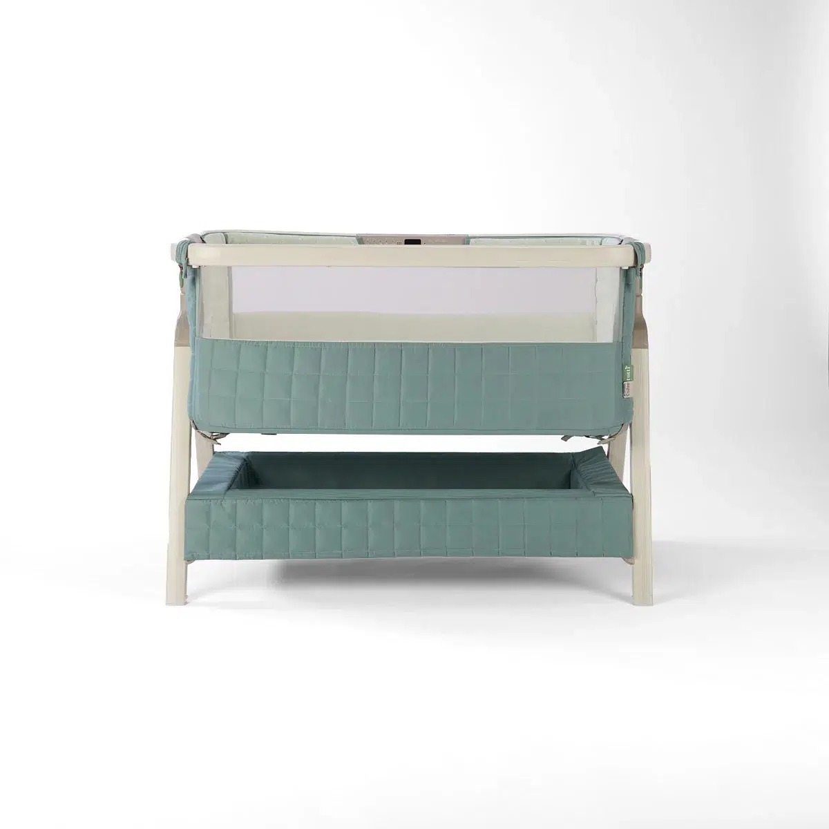 The CoZee Sense Bedside Crib in White Wash/Kelp, combines bedside closeness with an integrated sensory bar, offering soft light, ambient sound, and gentle projection in a cohesive design. Crafted with premium quilted fabrics, breathable mesh panels, and a soft bamboo-jersey mattress cover, it provides both comfort and contemporary style.