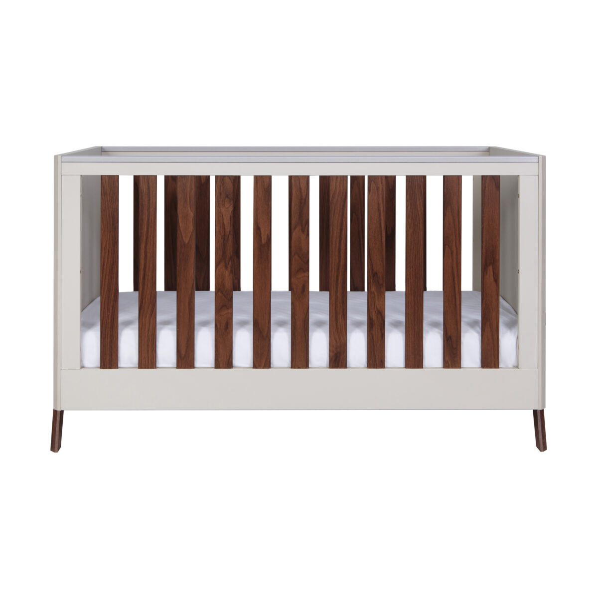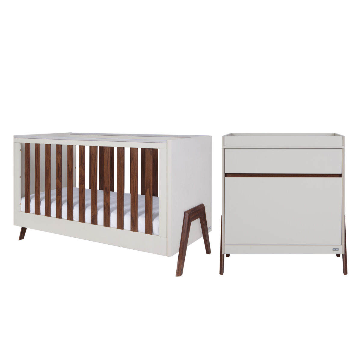 Meet the Tutti Bambini Fuori 2 Piece Nursery Furniture Set – Warm Walnut/White Sand – a Scandinavian-inspired blend of modern simplicity and functionality. With exposed legs and a sleek appearance, this set is an ideal choice for those who desire a clean, contemporary nursery look. Practical and versatile, this set includes a cot bed that converts to a toddler bed or sofa and a chest changer with ample storage for all your baby’s essentials.