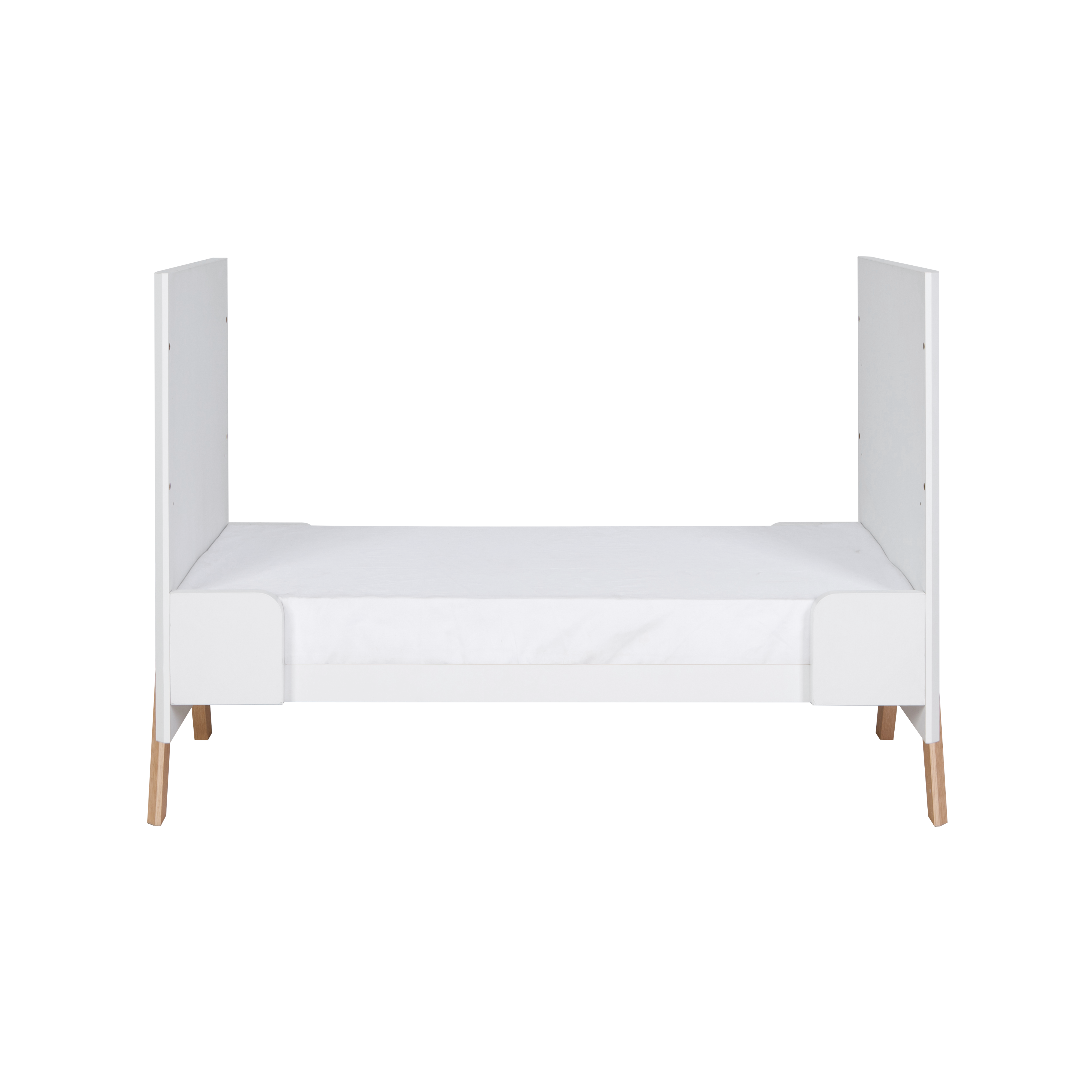 The Tutti Bambini Fuori Mini Cot Bed – White/Light Oak is a Scandinavian-inspired blend of modern simplicity and functionality. With exposed legs and a sleek appearance, this cot bed is an ideal choice for those who desire a clean, contemporary nursery look. Practical and versatile, this space-saving cot has three mattress height positions and effortlessly converts into a toddler bed or a sofa.