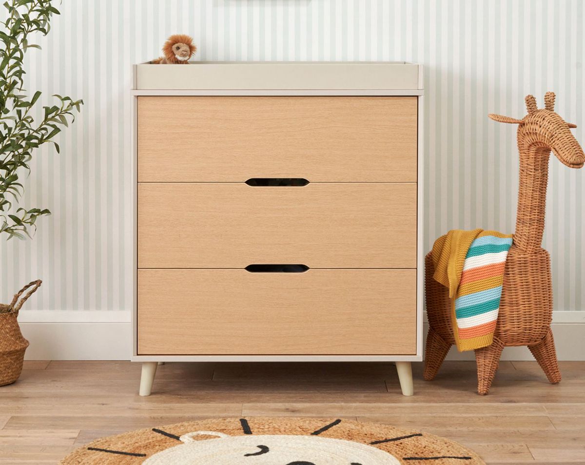 The Tutti Bambini Hygge 2 Piece Nursery Furniture Set with Cot Bed & Chest Changer – Light Oak/ White Sand embodies Scandinavian-inspired design, blending modern simplicity with functionality. With bevelled edges, splayed legs, and sleek cut-out handles, this set is perfect for creating a minimalistic, contemporary nursery. The versatile set includes a cot bed that transitions to a toddler bed or sofa and a chest changer with generous storage for all your baby’s essentials.