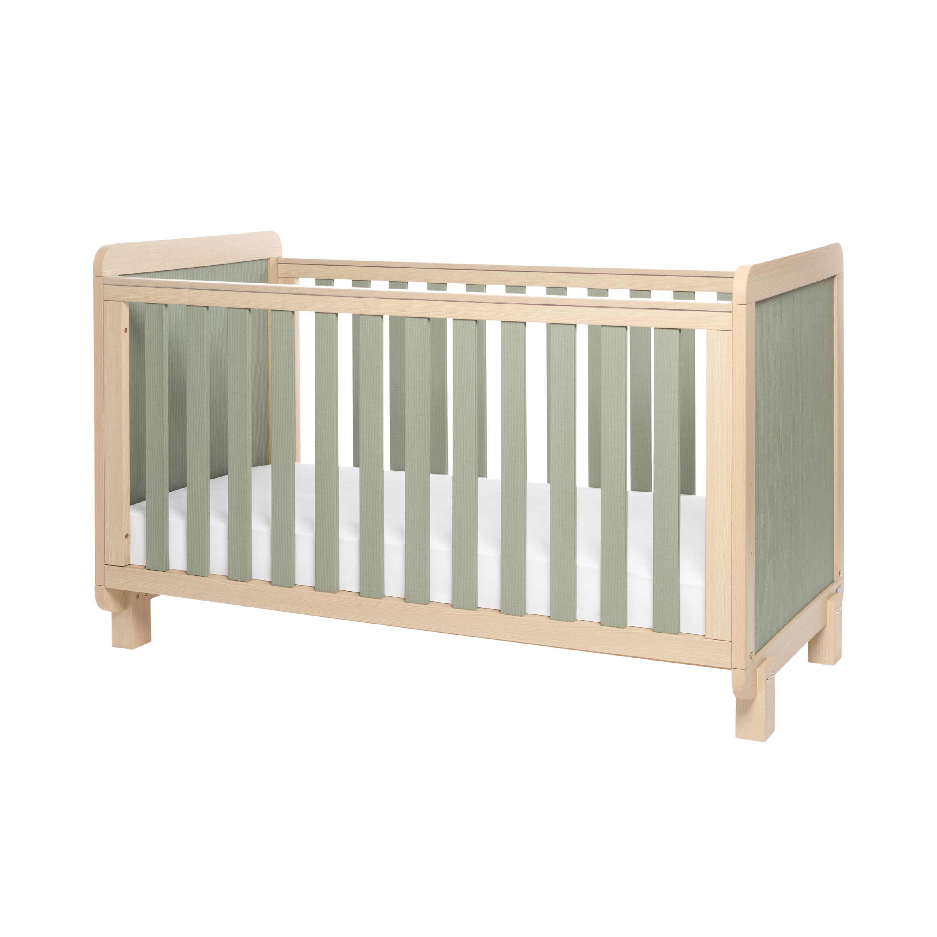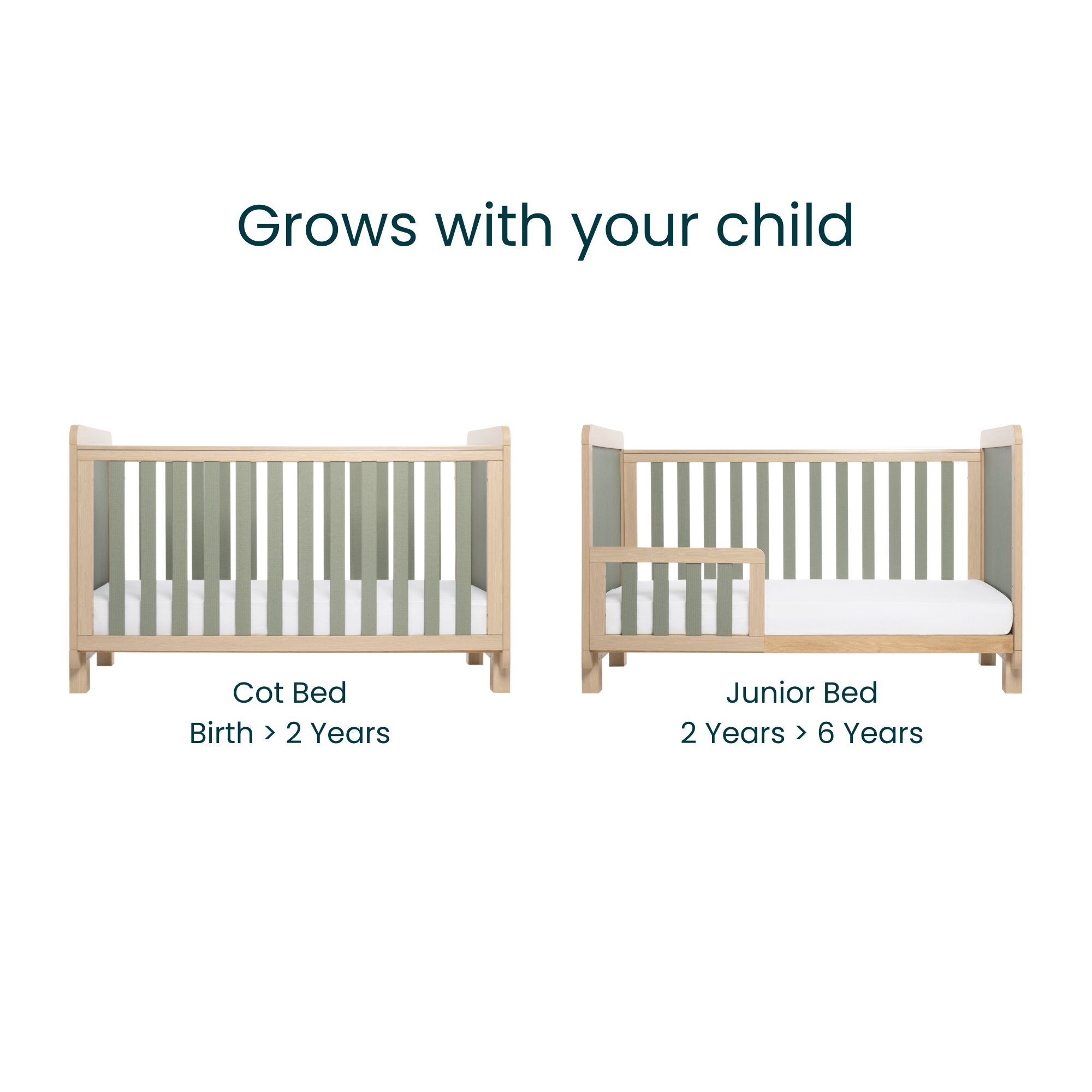 The Tutti Bambini Kuba Cot Bed – Golden Oak / Sage Weave offers exceptional convenience and safety at every stage from birth up to approximately 6 years. This fantastic cot bed features a solid yet stylish design with an adjustable mattress base, rounded corners, and protective teething rails. In addition, the Kuba Cot Bed easily transforms into a practical junior bed sofa with a special toddler rail, which increases safety during the transition to more independent sleeping.