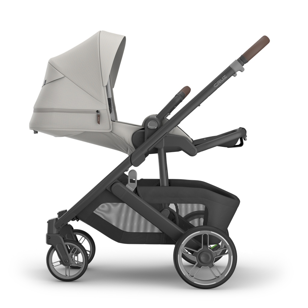 The pushchair is compatible with the Bassinet, Mesa®, and Aria™ Infant Car Seats, which can be attached directly to the frame. This transforms the Cruz V3 into a complete Travel System, offering exceptional portability and safety. Parents can seamlessly switch from car to stroll with the simple press of a release button, making everyday outings easier than ever.
