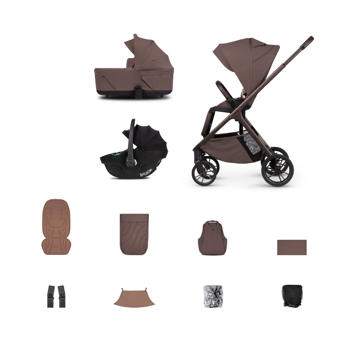 The Tila also comes complete with thoughtfully designed accessories. The apron offers warmth and wind protection, while the mosquito net and rain cover safeguard against insects and wet weather. The stylish coordinating bag and backpack provide practical storage, both with multiple compartments to keep essentials organised and close to hand.